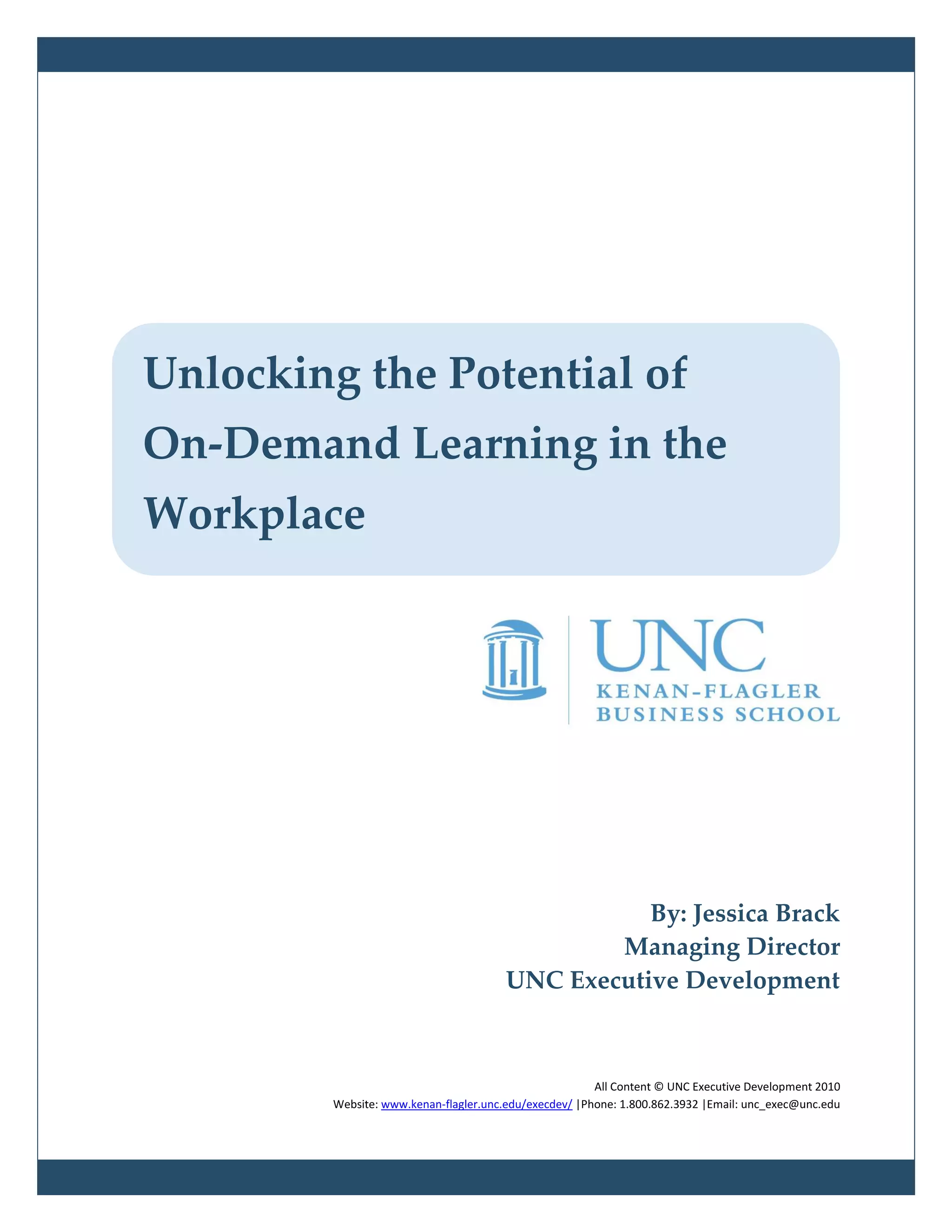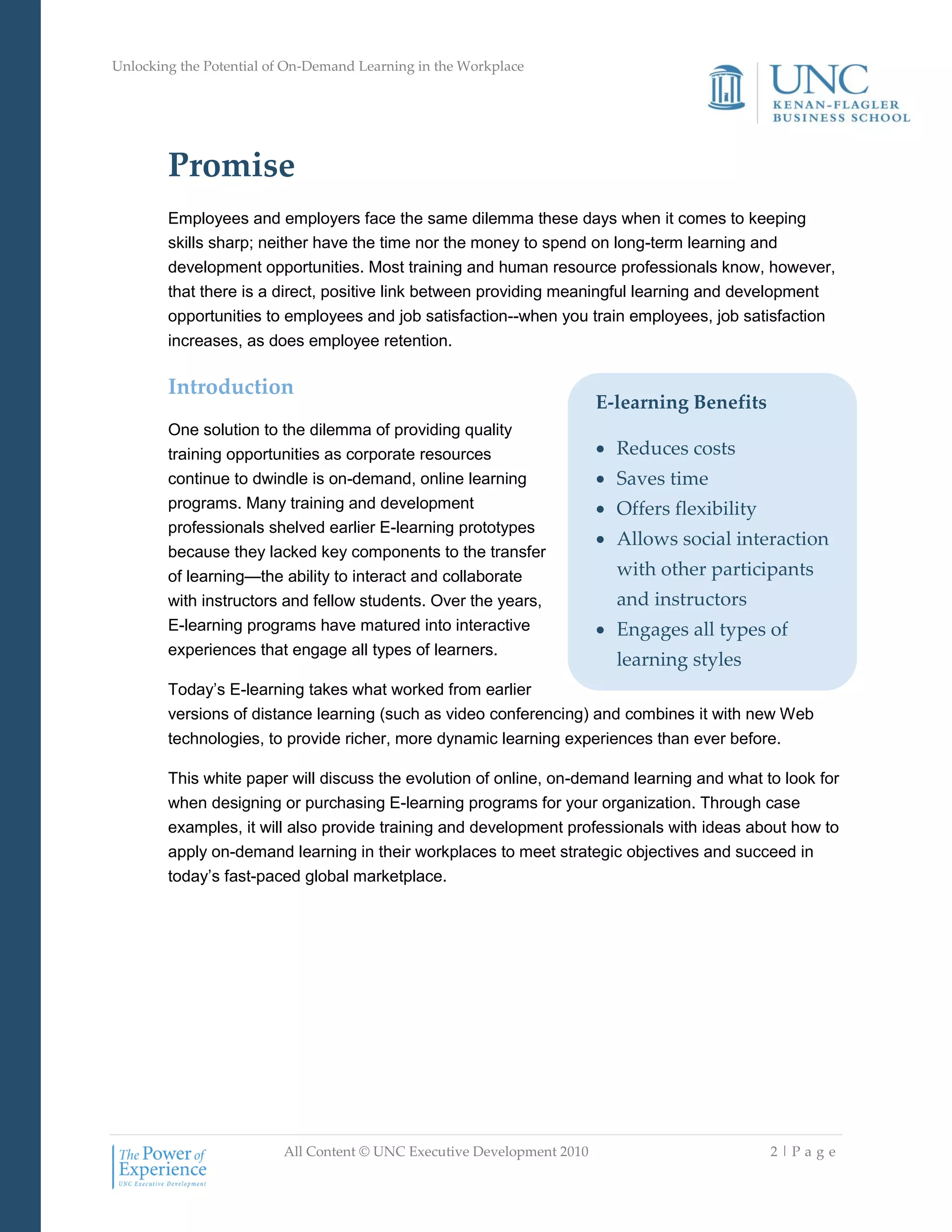 The document discusses the evolution and benefits of on-demand, online learning in the workplace, emphasizing its cost-effectiveness, flexibility, and enhanced employee engagement compared to traditional training methods. It highlights the growth of e-learning, particularly e-learning 2.0, which incorporates social interaction and collaboration, and provides case studies from organizations like UNC and Saint Elizabeth Health Care as examples of successful implementation. The paper encourages training professionals to consider blended approaches and to select high-quality e-learning programs that meet their organization's specific needs.
