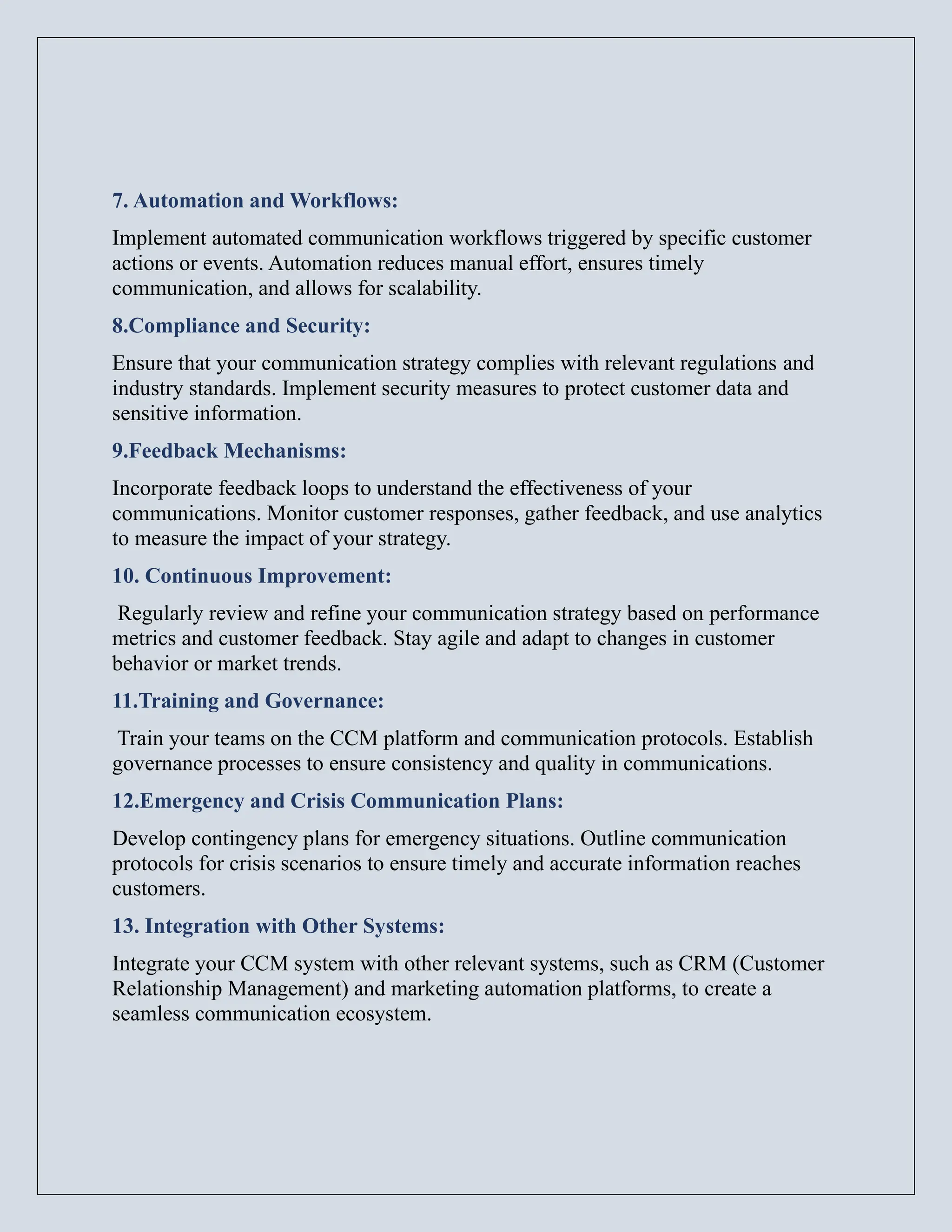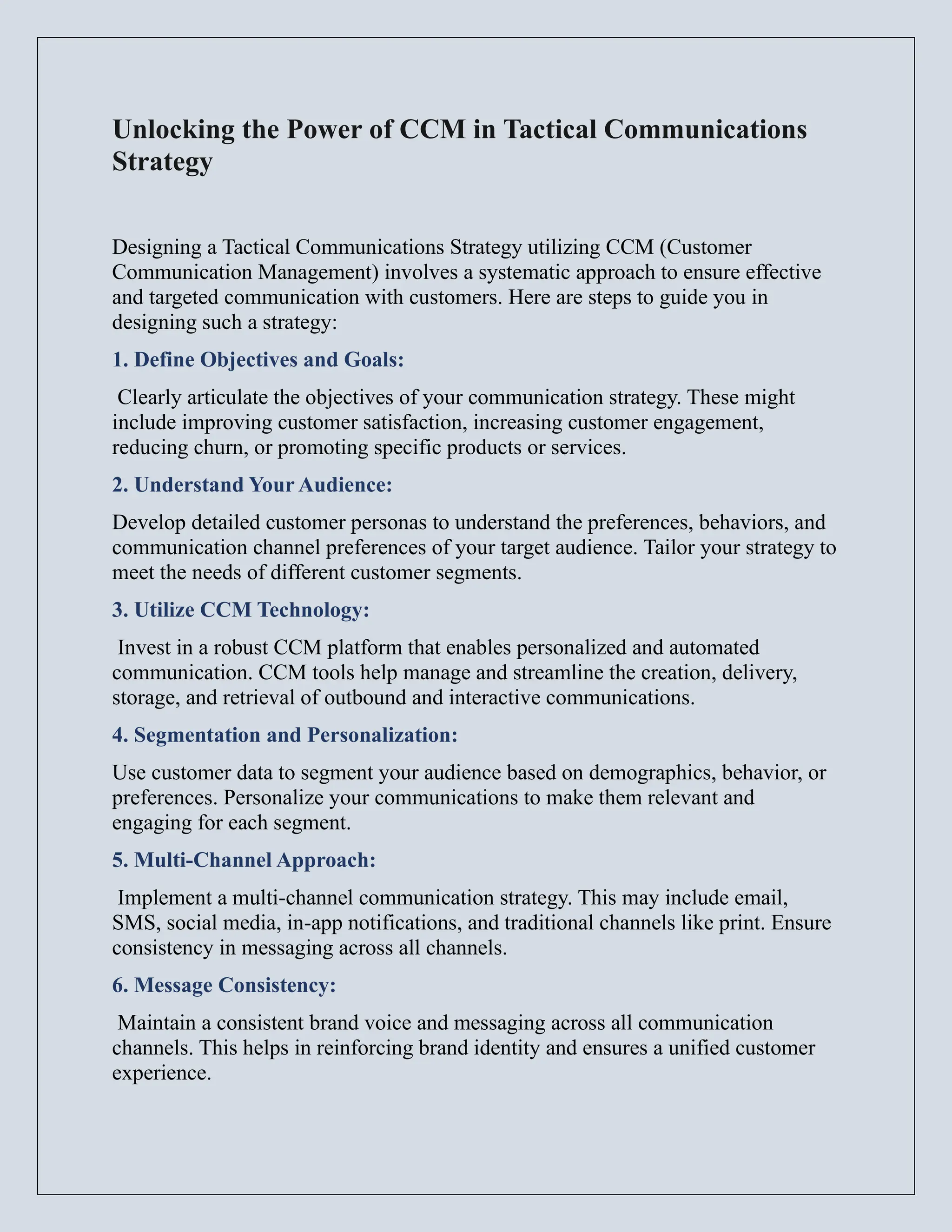 The document outlines a comprehensive approach to designing a tactical communications strategy using Customer Communication Management (CCM), emphasizing steps like defining objectives, understanding the audience, utilizing technology, and ensuring message consistency. It highlights the importance of personalization, a multi-channel approach, automation, compliance, and continuous improvement in enhancing customer communication. Ultimately, the strategy aims to improve customer engagement, satisfaction, and loyalty while adapting to changes in customer behavior and market trends.