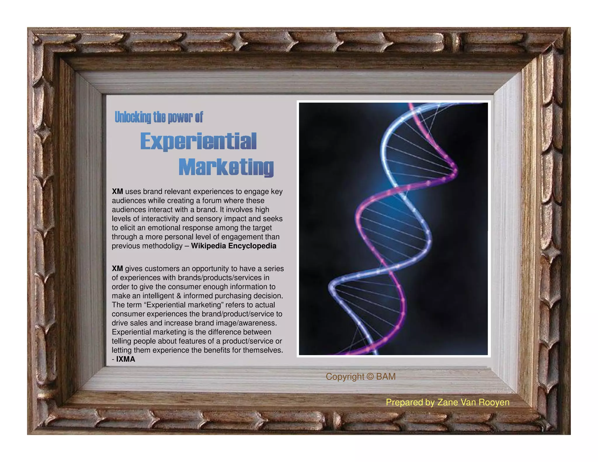 XM uses experiential marketing to engage audiences through interactive brand experiences that elicit emotional responses. It aims to provide consumers with experiences of a brand or product in order to give them enough information to make an informed purchase decision, rather than just describing product features. Experiential marketing lets consumers experience benefits directly rather than just being told about them.