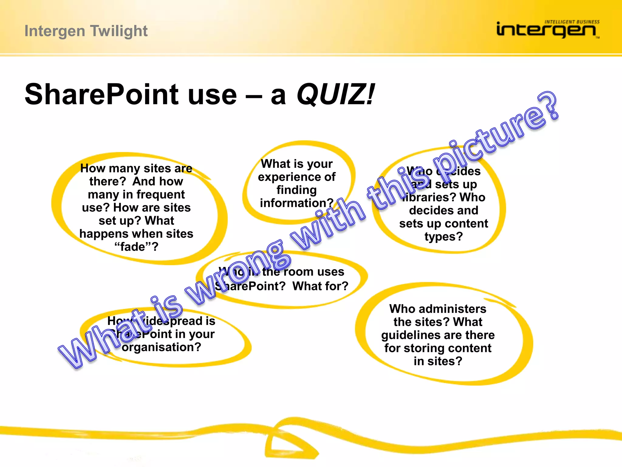 This document discusses establishing governance over SharePoint implementations to ensure value and manageability. It finds that only 50% of SharePoint projects have a business case and many organizations lack experience, guidance and policies. The presentation recommends developing a governance framework with principles, roles, processes and policies to provide structure and control over SharePoint use. An example framework outlines governance at different levels, and divides roles between executive, business, IT and end users. Questions are taken at the end regarding establishing a governance program.