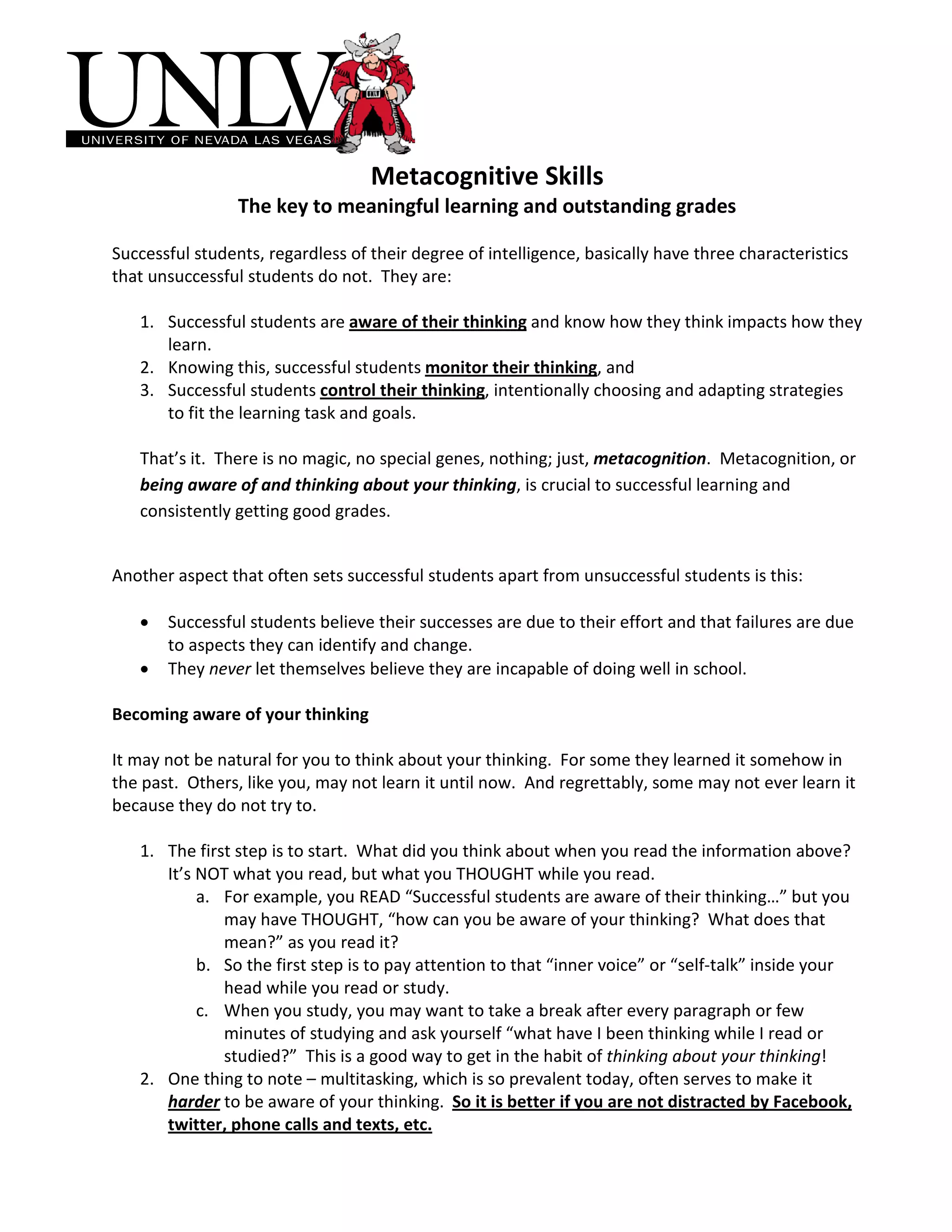 Metacognitive skills are essential for meaningful learning and achieving good grades, characterized by awareness, monitoring, and control of one's thinking. Successful students believe their achievements stem from effort and view failures as opportunities for improvement. Developing metacognitive abilities involves planning, monitoring, evaluating, and constructing knowledge, alongside avoiding distractions to enhance focus and learning effectiveness.