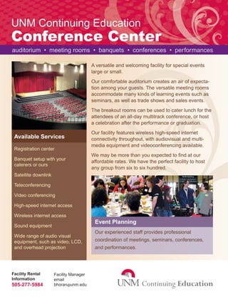 The document outlines the offerings and mission of UNM Continuing Education, emphasizing its commitment to providing high-quality training programs and resources for personal and professional development. It includes information on course registration, tuition remission for eligible participants, and various programs designed for different age groups and interests. Additionally, it highlights the community service aspect by advancing lifelong learning opportunities through workshops, certifications, and customized training solutions.