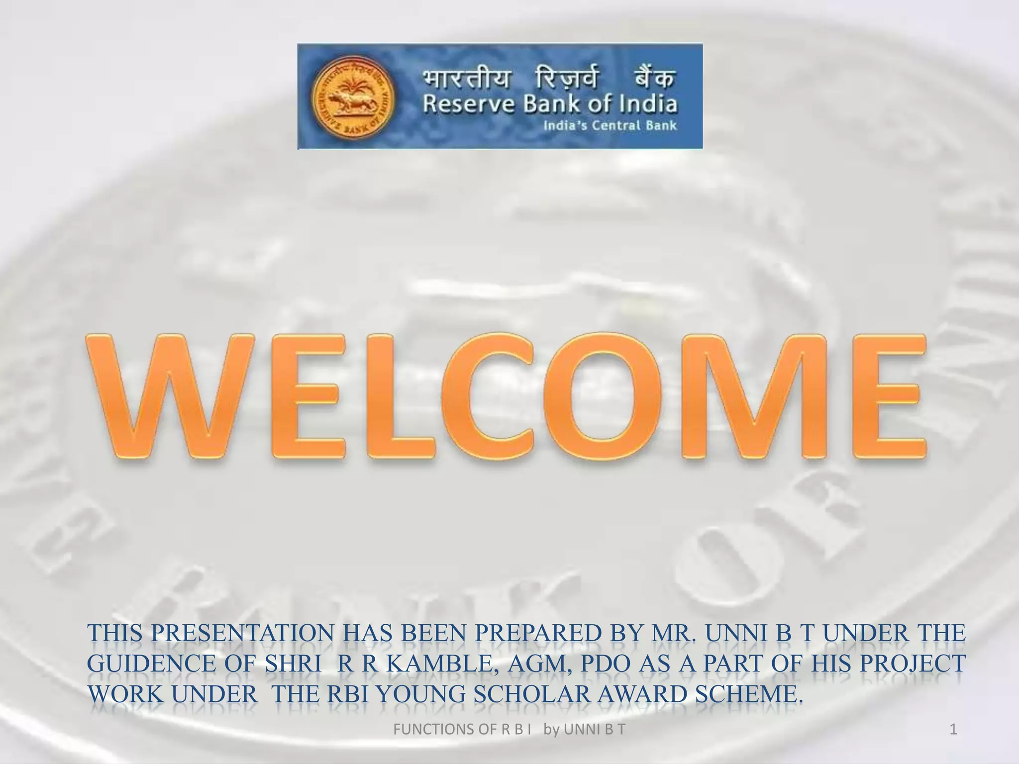 This presentation summarizes the main functions of the Reserve Bank of India (RBI). It discusses that RBI was established in 1935 as India's central bank. The key functions of RBI include issuing currency, acting as the government's bank and banker to banks, regulating the country's financial system, managing foreign exchange, implementing monetary policy, and promoting financial inclusion through various developmental initiatives. The presentation provides details on RBI's role in each of these functional areas.