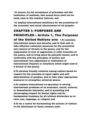 The United Nations was established in 1945 with the goals of maintaining international peace and security, developing friendly relations among nations, achieving international cooperation, and being a center for harmonizing nations' actions. The six main organs of the UN are the General Assembly, Security Council, Economic and Social Council, Trusteeship Council, International Court of Justice, and Secretariat. The General Assembly consists of all UN members and discusses any issues within the UN's scope, while the Security Council has primary responsibility for international peace and security.