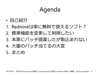 2017/05/13 第12回redmine.tokyo 勉強会UnofficlaCookingの紹介とRedmine本家への貢献 @y503unavailable 2