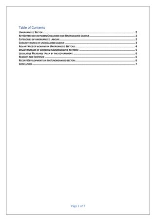 The document discusses the unorganized sector in India. It begins by defining the unorganized sector and noting that it generates over 50% of India's GDP. It then outlines the key differences between organized and unorganized labor. It categorizes unorganized labor into four groups: occupation, specially distressed, service categories, and nature of employment. It details the characteristics of unorganized labor such as lack of protections, debt bondage, and irregular hours. It also discusses the advantages and disadvantages of working in the unorganized sector, such as direct interaction with employers but lack of job security. Recent government measures for the unorganized sector are also mentioned.