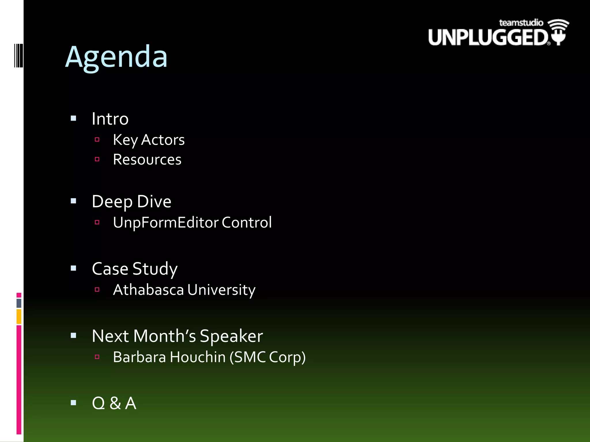 The document outlines the agenda for the Unplugged Mobile Controls User Group meeting in March 2014, featuring key actors such as Steve Ives and Matt White. It includes a deep dive on the unpformeditor control, a case study on Athabasca University's implementation, and resources for further learning. The next meeting is scheduled for April 3rd, with a focus on the unpcomputednavigator and a case study from SMC Corp.