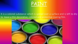 Paint is a colored substance that is spread over a surface to form a decorative and protective coating. It has components like pigments, solvents, additives, and resins. There are different types of paints like enamel, emulsion, cement, and bituminous paints. Paints can be water-based or oil-based and are classified according to their composition and drying method. Varnish is a transparent protective finish used in wood finishing that intensifies the natural grains. It forms a hard, durable, water-resistant film and does not hide the wood grains.