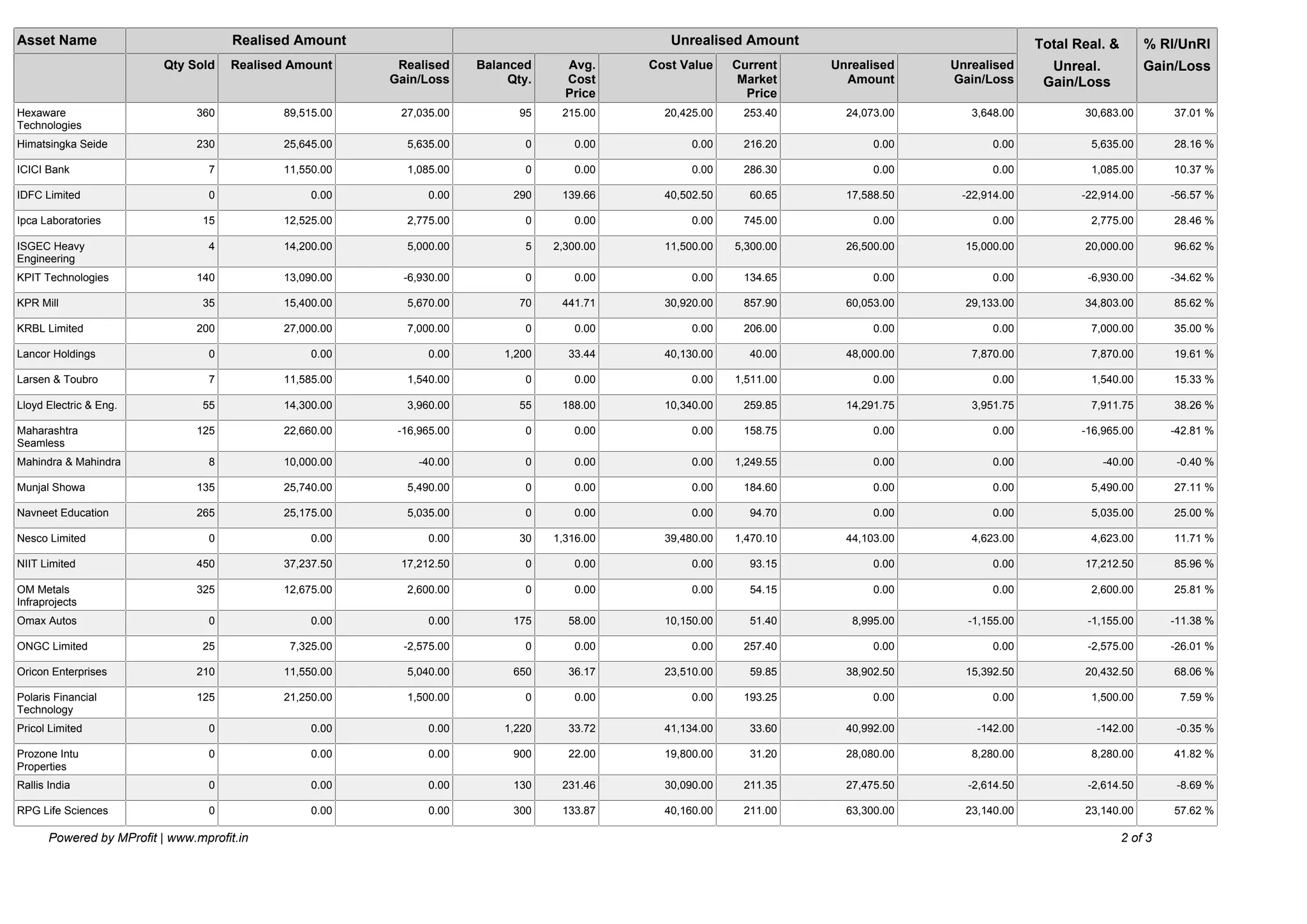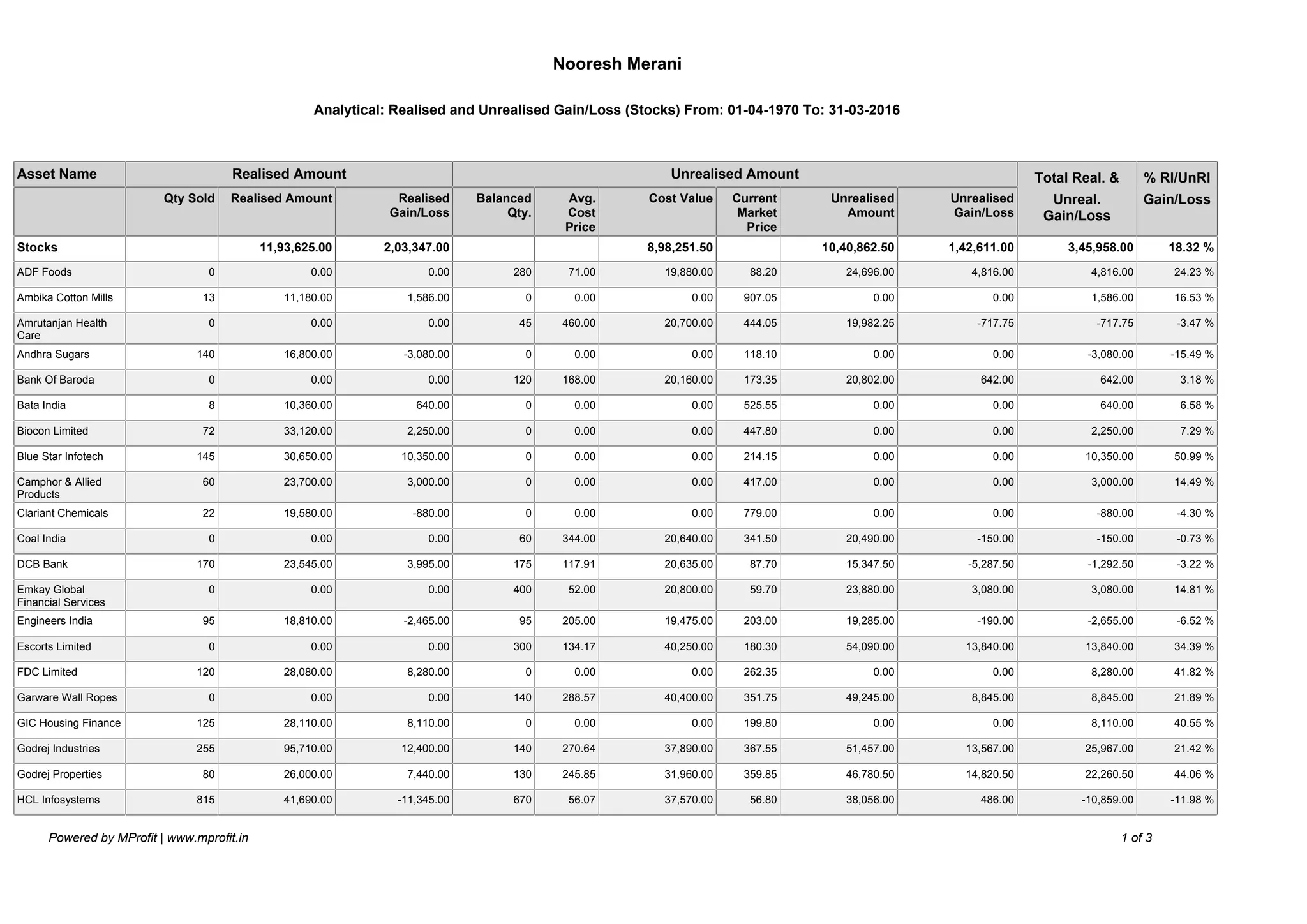 The document appears to be an analytical report listing stocks and their realized and unrealized gains and losses between April 1, 1970 and March 31, 2016. It includes information on the quantity sold, realized amount, realized gain/loss, balance quantity, average cost price, current market price, unrealized amount, unrealized gain/loss, and total gain/loss for each stock. A total realized amount of ₹11,93,625.00 and total unrealized amount of ₹2,03,347.00 is reported, with an overall gain of ₹3,45,958.00 or 18.32%.