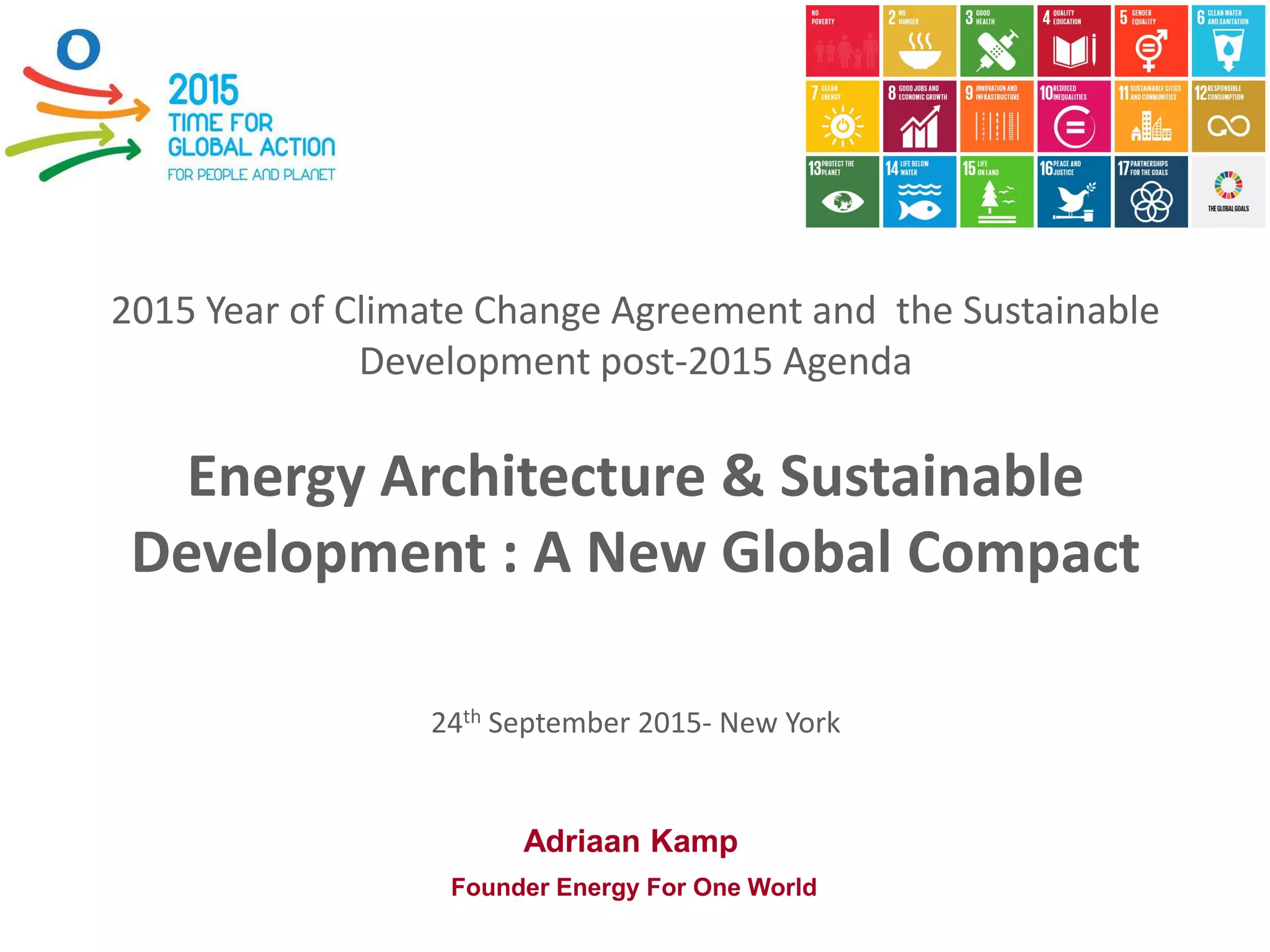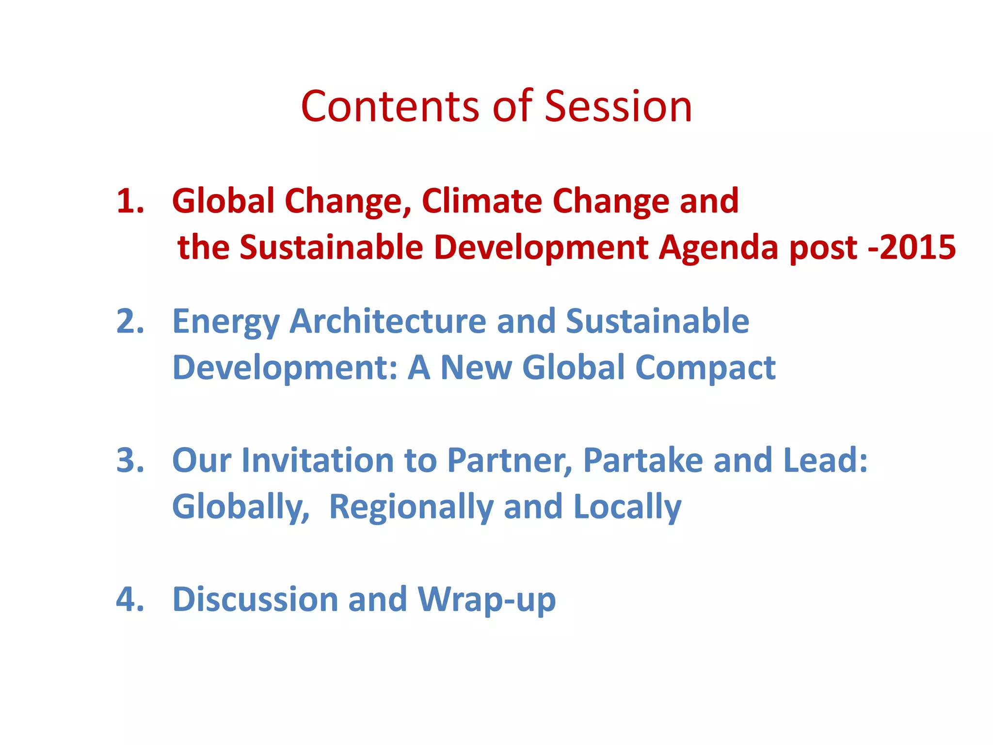 This document outlines a presentation on global changes relating to climate change and sustainable development. It discusses how the world's energy architecture and systems must be improved to ensure energy availability, affordability and sustainability for all. This includes reducing fossil fuel dependence in developed nations to allow growth in developing nations, with renewable energy powering overall growth. Public-private partnerships are needed to drive the transition to more sustainable energy architectures. The presentation invites partnerships to help build sustainable communities and societies through education, projects and new approaches to the energy industry.