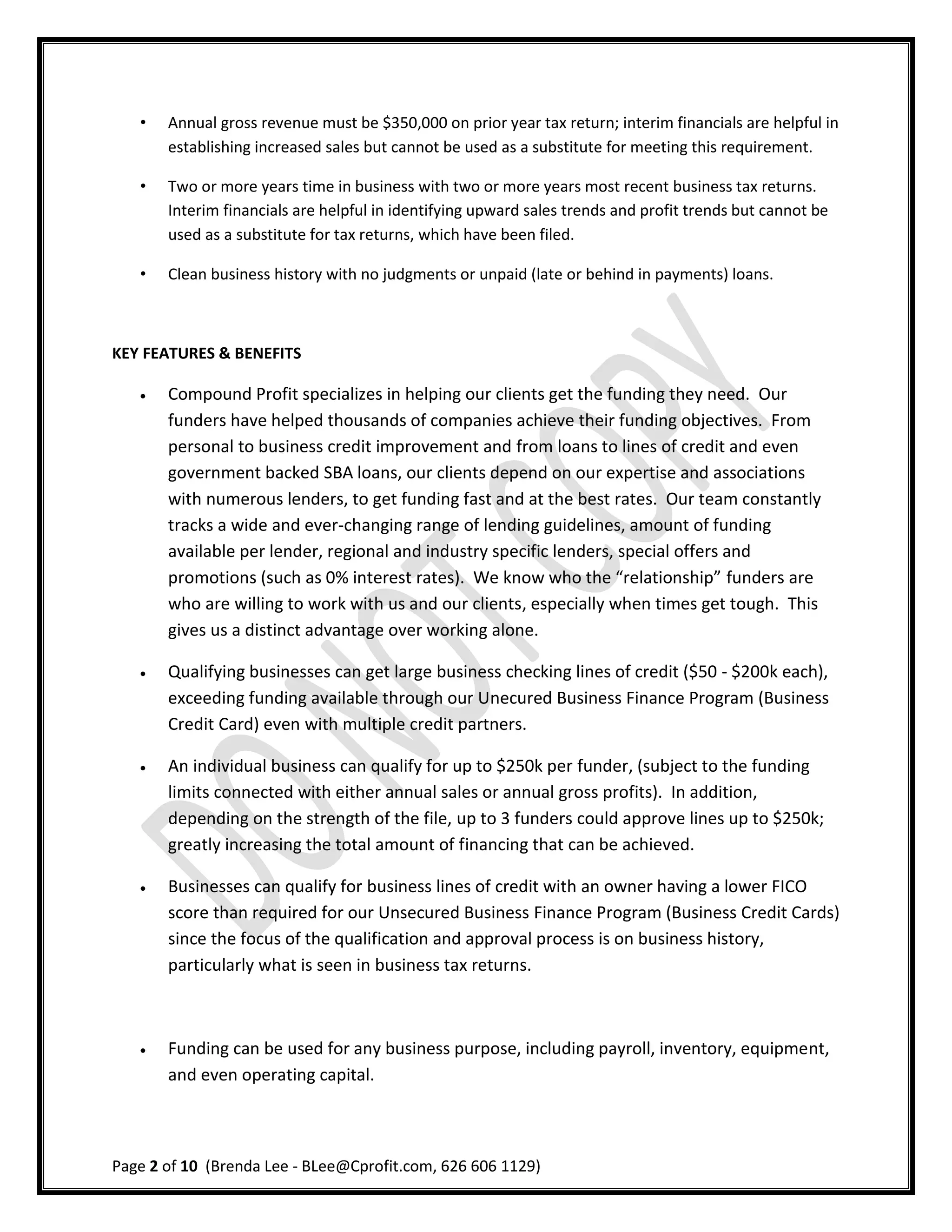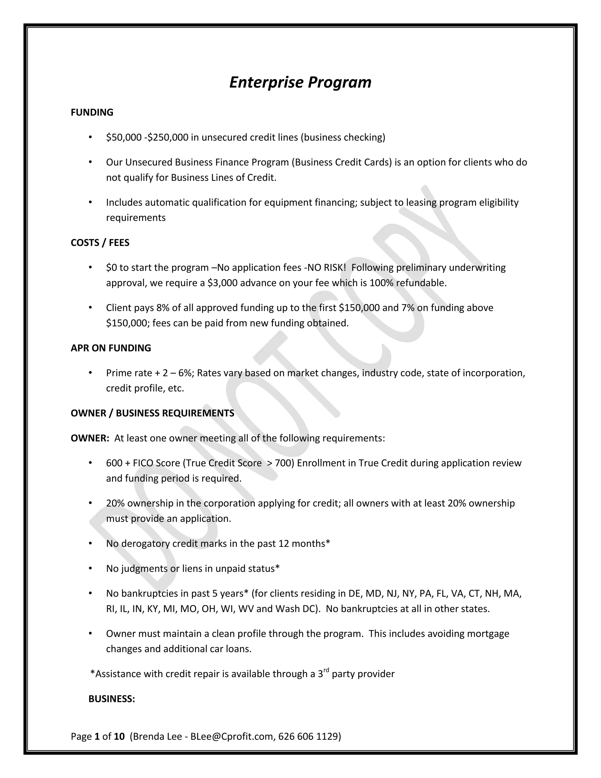 This program provides business owners with funding options including unsecured business credit lines ranging from $50,000 to $250,000 and business credit cards. Fees are 8% of the first $150,000 and 7% of amounts over $150,000 of approved funding. Interest rates are prime plus 2-6%. To qualify, businesses must have $350,000 annual revenue, be in business for 2+ years, and owners must have at least 20% stake, 600+ credit score, and no bankruptcies in the last 5 years. This program aims to help businesses access working capital through competitive credit lines and cards while building business credit history.