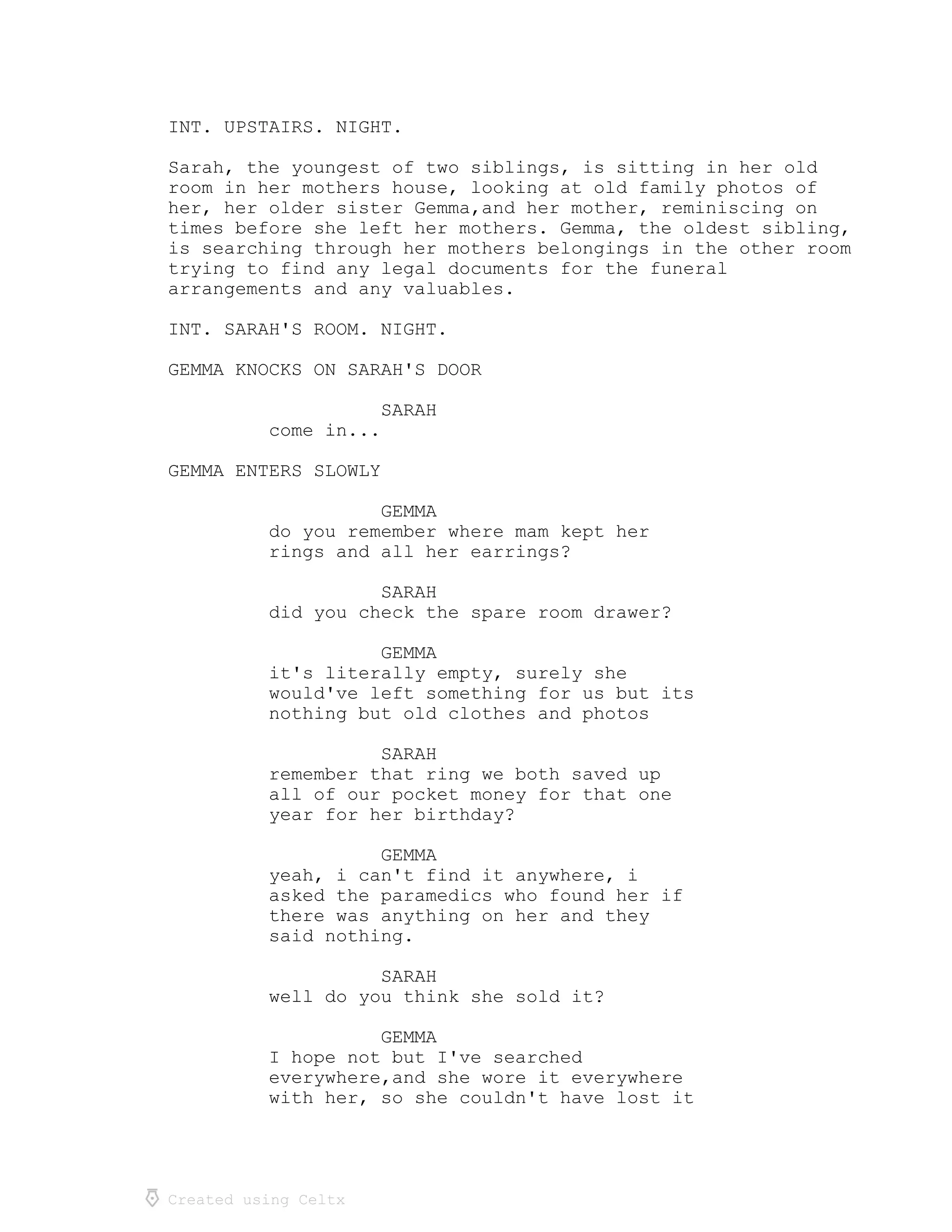 Two sisters, Sarah and Gemma, are going through their recently deceased mother's belongings when Sarah thinks she hears a noise downstairs. Gemma investigates but is attacked by an intruder with a knife. Gemma fights off the intruder to allow Sarah time to call for help, but is fatally stabbed in the process. Sarah manages to call 911 but the intruder attacks her as well. Gemma makes a final push to save Sarah, but is killed in the process. Sarah then stabs and kills the intruder just as police arrive.