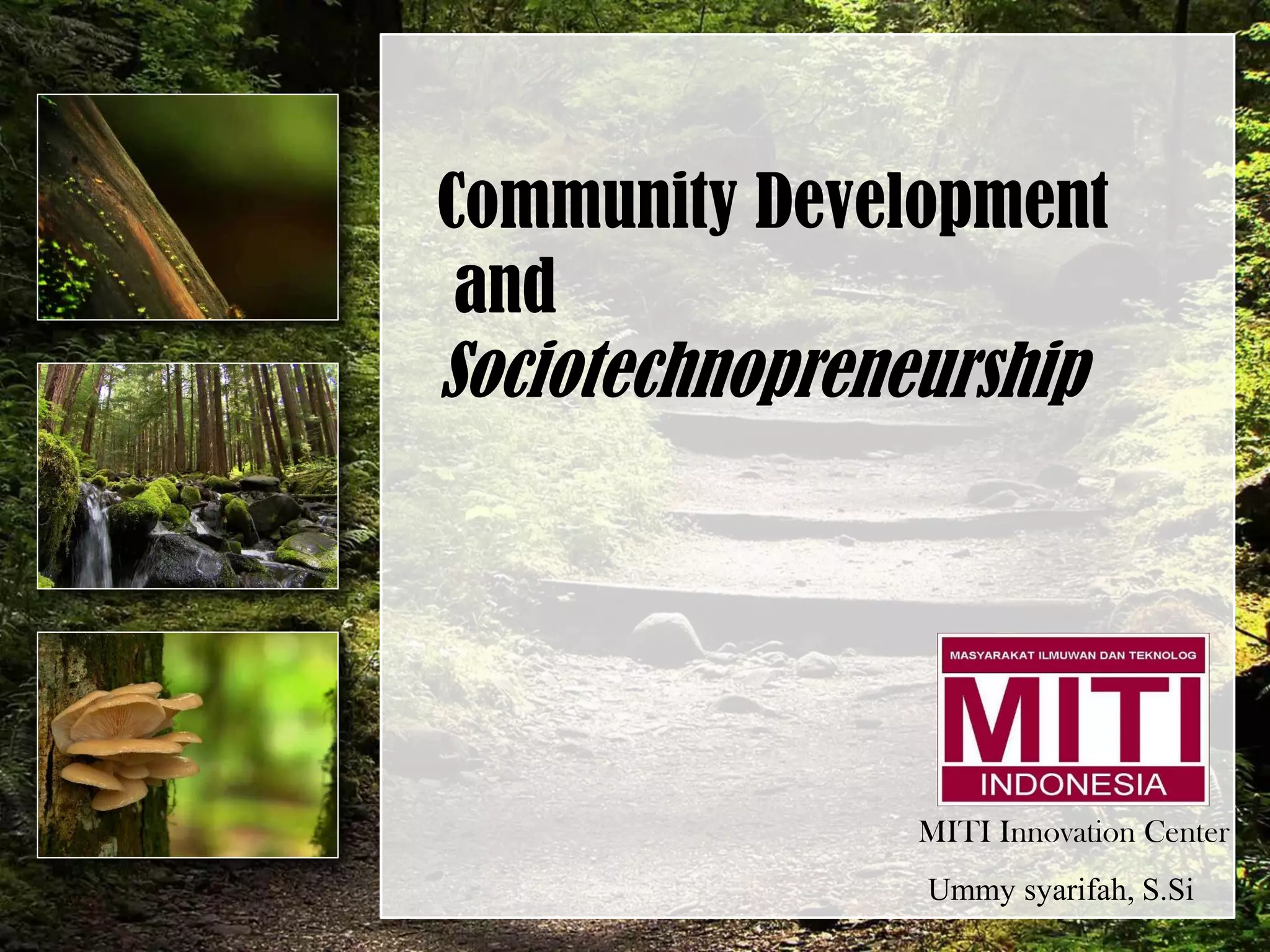 Dokumen tersebut membahas tentang pembangunan komunitas dan sosioteknopreneurship. Pembangunan komunitas bertujuan untuk memberdayakan dan membuat masyarakat mandiri terutama dari kemiskinan. Sosioteknopreneurship merupakan konsep baru yang menggabungkan penerapan teknologi, inovasi bisnis, dan kewirausahaan untuk memberdayakan masyarakat. Sosioteknopreneur bertujuan untuk melibatkan partis