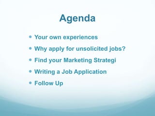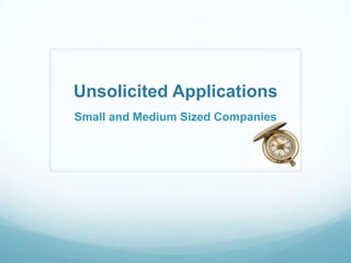 This document provides information and guidance for small and medium companies on applying for unsolicited jobs. It discusses researching companies to identify potential job openings, developing a marketing strategy, writing a concise job application, and following up after applying. Tips are provided on profiling the ideal candidate for a role, locating relevant companies to apply to, and utilizing networks and online resources to research companies and find job postings not otherwise advertised. The benefits and challenges of unsolicited or "cold" applications are reviewed.