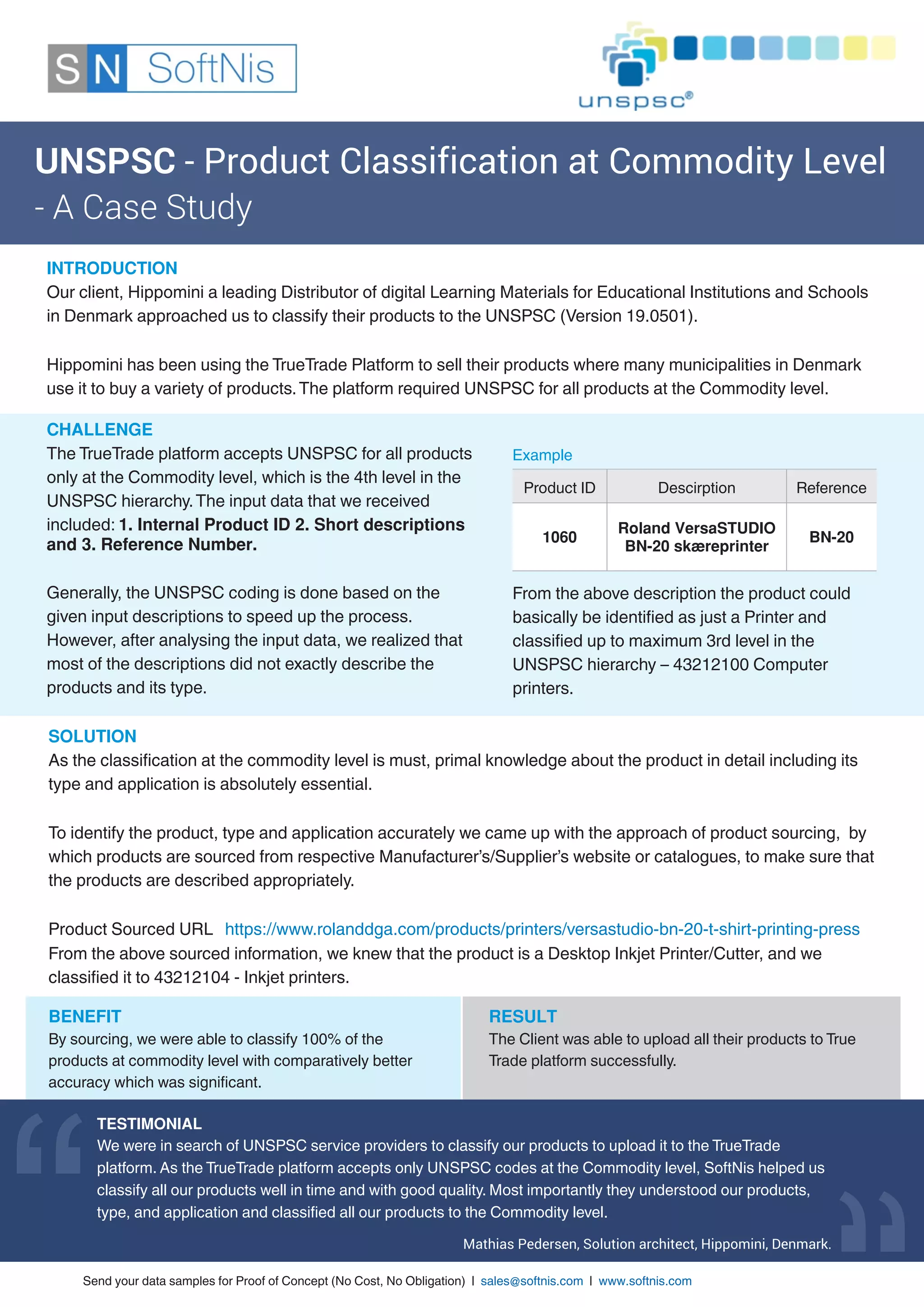 Hippomini, a Danish distributor of digital learning materials, needed to classify its products using the UNSPSC system at the commodity level for its supplier platform TrueTrade. SoftNis analyzed Hippomini's product data and found the descriptions lacked detail. To accurately classify the products, SoftNis sourced the products directly from manufacturers' websites to determine each product's type and application. This allowed SoftNis to successfully classify 100% of Hippomini's products at the commodity level for the TrueTrade platform. Hippomini was satisfied it could upload all its products and that SoftNis understood its products well enough to classify them at the required level of specificity.