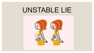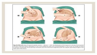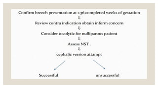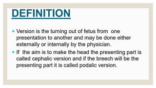 This document discusses unstable lie and version in pregnancy. It defines unstable lie as a condition where the fetal presentation constantly changes beyond 36 weeks of pregnancy when it should have stabilized. Causes include factors that prevent the presenting part from remaining fixed in the lower uterus. Complications include cord entanglement and increased risk of perinatal death. External cephalic version can be attempted to correct the malpresentation if there are no contraindications. Hospitalization is recommended at 37 weeks to monitor for premature rupture of membranes or cord prolapse. Elective c-section is often required, especially if complicating factors are present.