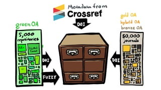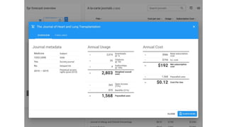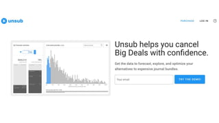 Unpaywall provides a complete index of open access articles that can be used by libraries and researchers to identify content that is freely available rather than needing to be purchased through journal subscriptions. The summary analyzes data on open access availability and usage trends to forecast that 50% of article views could currently be fulfilled through open access, increasing to 70% in five years, meaning subscriptions will only be needed for 30% of content. It encourages libraries to cancel "big deal" journal subscription packages with confidence, using the Unpaywall tool and data to show alternative access options and potential cost savings over time.
