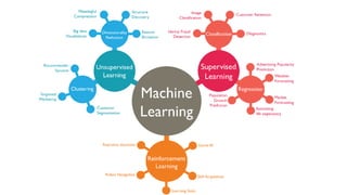 This document provides an overview of unsupervised learning techniques in scikit-learn including k-means clustering, hierarchical clustering, principal component analysis (PCA), and non-negative matrix factorization (NMF). It discusses how to choose the optimal number of clusters k for k-means using the elbow method by selecting the value of k at the point where the distortion starts decreasing linearly. It also describes hierarchical clustering as successively merging the closest clusters and PCA as finding linear combinations of variables with maximal variance to produce low-dimensional representations. NMF is characterized as factorizing a matrix into two matrices where the columns of one represent topic probabilities and rows of the other represent term frequencies in each topic.