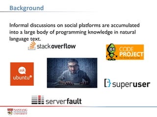 The document presents a method for unsupervised inference of software-specific morphological forms from informal discussions on platforms like Stack Overflow and Wikipedia. It describes challenges in natural language processing due to diverse morphological word forms, such as synonyms and abbreviations, and outlines an approach to build a domain-specific thesaurus that groups related terms based on semantic and lexical information. The evaluation shows significant coverage of software-specific vocabulary, with high accuracy in identifying abbreviations and synonyms.