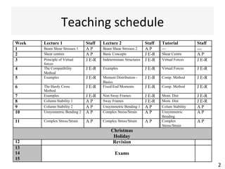 The document outlines a teaching schedule and key concepts related to unsymmetrical bending in structural mechanics, including methods for analyzing shear stresses and principal moments for asymmetric sections. It discusses the theoretical extension of symmetric bending theory to unsymmetrical cases, as well as tools like the Mohr's circle for stress analysis. Learning outcomes include determining principal directional moments and evaluating normal stresses in beams under unsymmetric bending conditions.