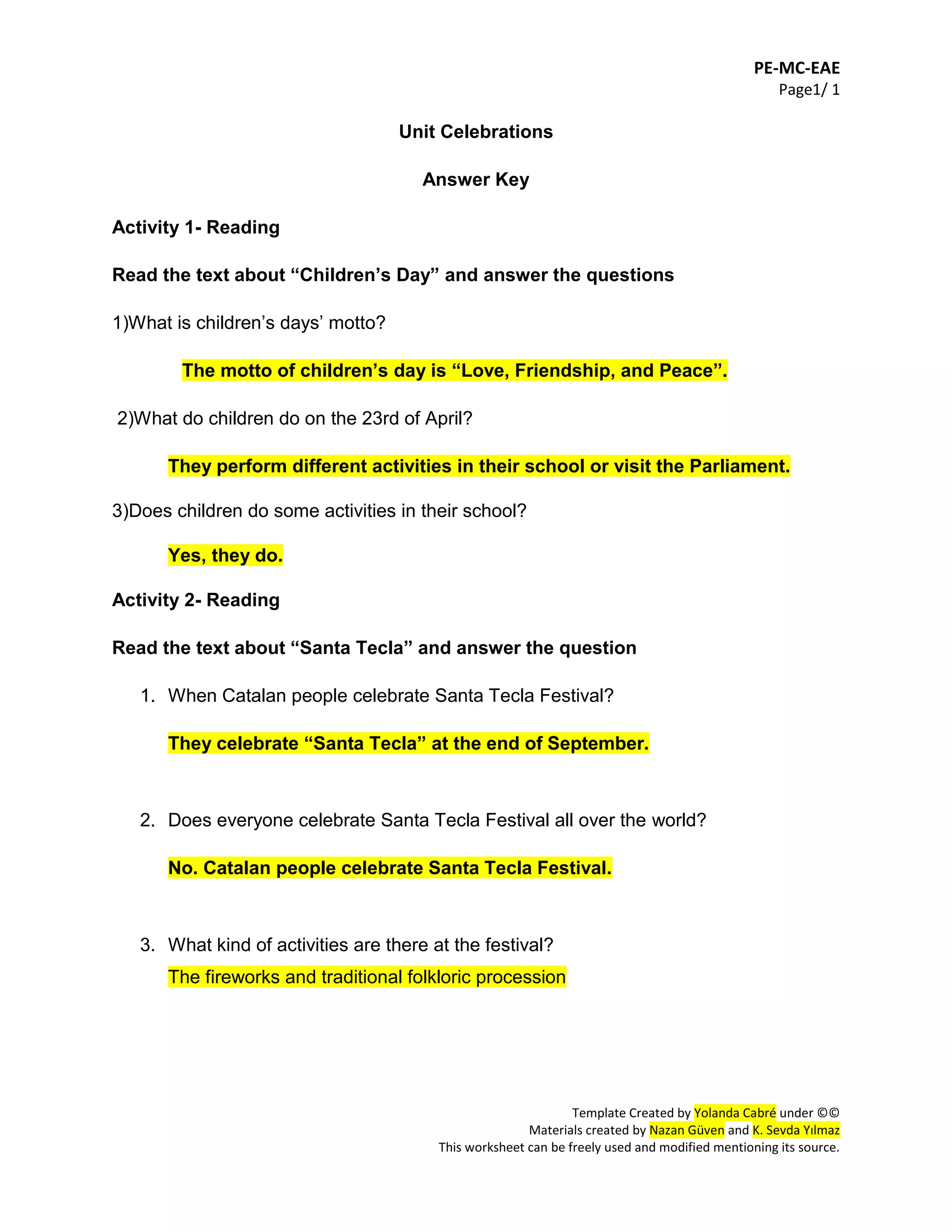 This document contains an English worksheet with various activities and reading passages about celebrating different holidays and festivals. It includes questions and exercises about Children's Day, Santa Tecla Festival, Christmas, Easter, Halloween, and other celebrations. The worksheet provides answer keys, transcripts of listening passages, and instructions for students to complete speaking, writing, reading, and matching activities related to cultural events and holidays around the world.