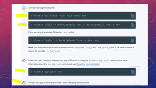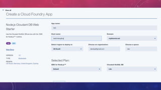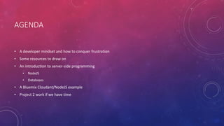 This document provides an overview of various topics related to developing a NodeJS application with a database. It discusses mindsets for developers, resources for learning to code like online courses and communities, and technologies involved in web development like front-end versus back-end programming. It also introduces NodeJS, databases like MongoDB and Cloudant, and provides instructions for an example app using Cloudant on Bluemix. Students are assigned homework to deploy this example app and modify it for their own purposes.