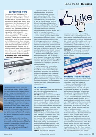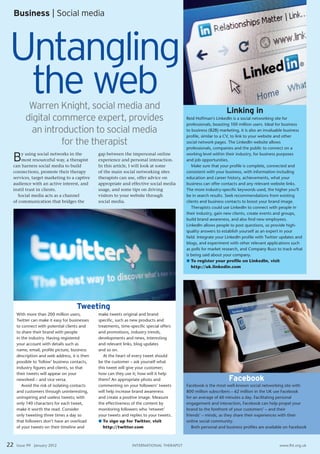 Social media can help therapists build connections, promote their services, and target marketing. LinkedIn allows professionals to connect, gain clients, and establish expertise. Twitter enables connecting with contacts and sharing brand updates. Facebook facilitates engagement and brand awareness through sharing with friends. Blogging on WordPress provides a way to share relevant industry content and drive visitors to build an audience. Content should engage audiences and encourage sharing to expand brand reach through social media.