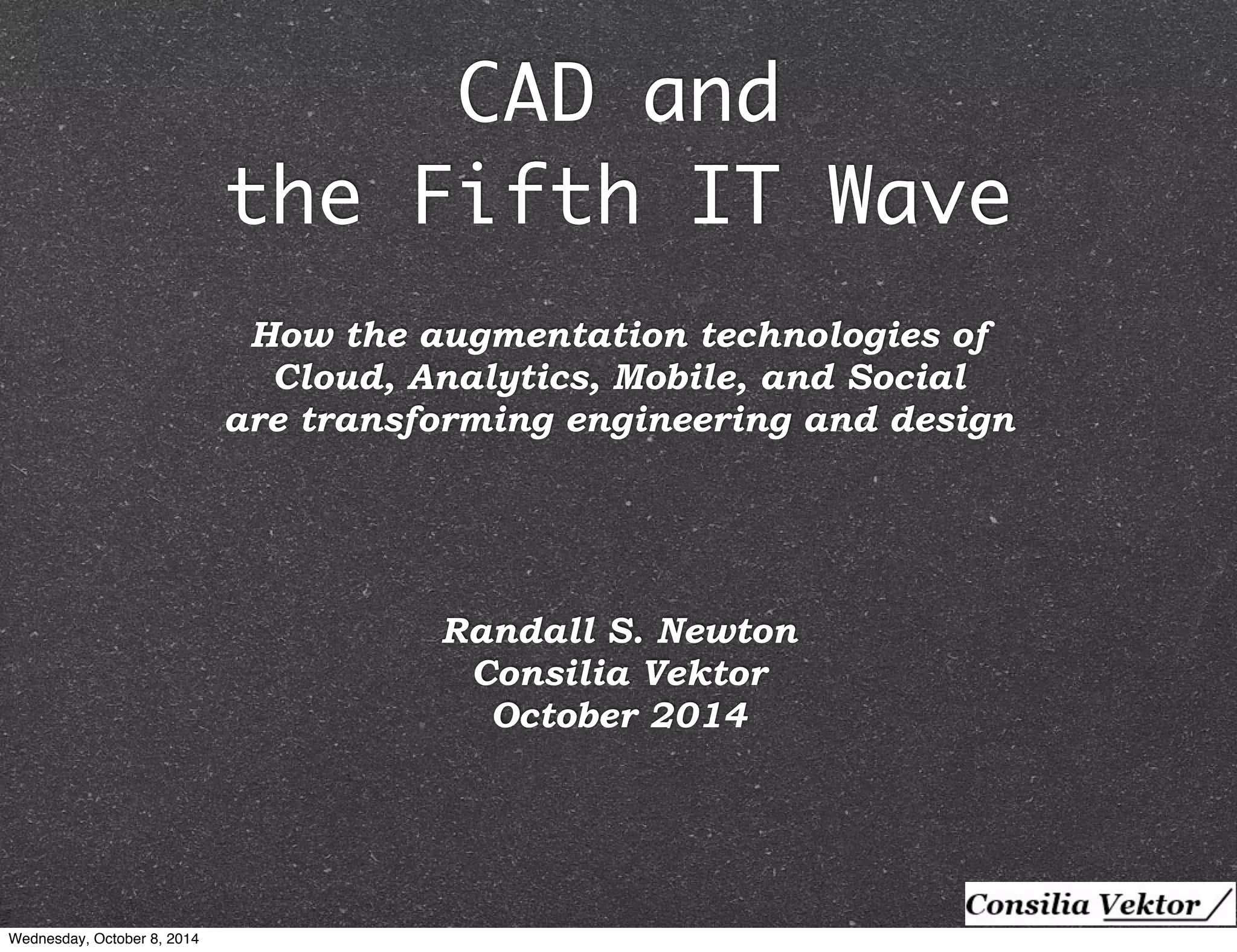 The document discusses how augmentation technologies, including cloud, analytics, mobile, and social tools, are transforming engineering and design practices. It highlights the transition from traditional software workflows to more collaborative and real-time design processes, enabling untethered engineering and open collaboration across global teams. The text emphasizes the need for integrating digital technologies at every stage of construction and manufacturing to improve efficiency and innovation.