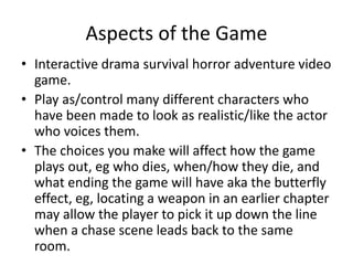 Until Dawn is an interactive drama survival horror adventure video game where the player controls different characters and their choices determine how the story unfolds. The game begins with a therapy session that will affect future scenes, and uses first-person perspective and breaking the fourth wall. The decisions made by the player will change each character's personality and characteristics over time. Elements of the game relate to postmodern concepts like the blurring of reality and virtual life, declining meta-narratives, and the player shaping the narrative through their choices of what actions to take.