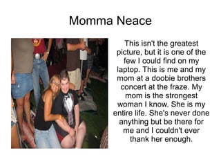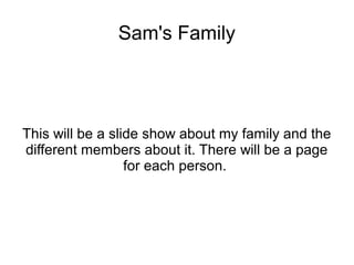 This document introduces the members of Sam's family through a slideshow. It includes pages on Sam's mom, dad, sister Erica, brother Jason, sister Rachel and her boyfriend, Sam himself who was adopted, nephew Jace who Sam is very close with, and friend Jasper who Sam also cares for. The pages provide some details about each family member and Sam's relationship with them.