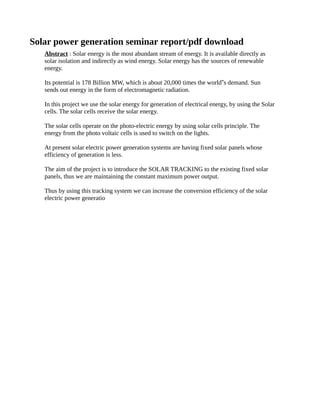 Solar energy has great potential at 178 billion MW, which is 20,000 times world demand, and can be harnessed directly from sunlight or indirectly from wind. This project uses solar cells to convert sunlight into electrical energy by operating on the photoelectric effect. The current aim is to increase efficiency by introducing solar tracking to existing fixed solar panels to maintain maximum constant power output.