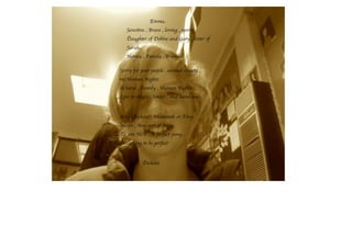 Emma is a sensitive, brave and loving daughter in a family with her sister Sarah. She enjoys horses, her family and friends. She advocates for human rights and preventing cruelty to people and animals. Emma strives for perfection in her riding and her pony to win high honors at competitions.