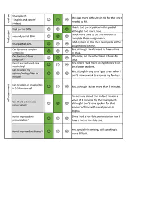 This document contains a student's self-assessment of their English skills over the course of a semester. It includes ratings and comments on their attendance, participation, handling of course materials, homework, quizzes, exercises, activities, assignments, and ability to write paragraphs, produce sentences, express opinions, hold conversations, and improve pronunciation and fluency. The student identifies areas they can improve, such as being more focused in class, being prepared with materials, reading more, and speaking more English. They rate their writing skills starting around a 7 and ending at a 9 out of 10. They recognize the importance of writing skills for their future academic and career development.