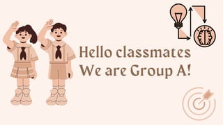 Group A presented on using Canva Presentations to create engaging presentations. They introduced their group members and explained how Canva Presentations allows for real-time collaboration, inclusion of animations and transitions, and pre-recording presentations to share anywhere. Their presentation covered goals of the tool, its history of enabling collaboration, and key concepts like designing, planning, and presenting all in one place using Canva Presentations.