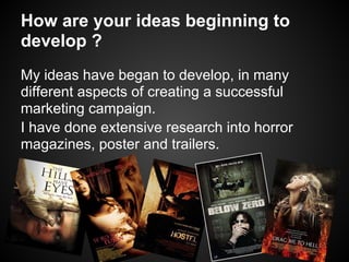 The document discusses the development of ideas for a marketing campaign for a horror film trailer. The author has researched horror magazines, posters, and trailers, and based on their resources and interest in horror, has decided to create a horror genre trailer. They recognize they must consider the rating of the trailer, where posters will be shown and if the trailer can be screened on networks. Anticipated challenges include availability of locations, equipment, and actors/actresses, which the author plans to address through efficient scheduling.
