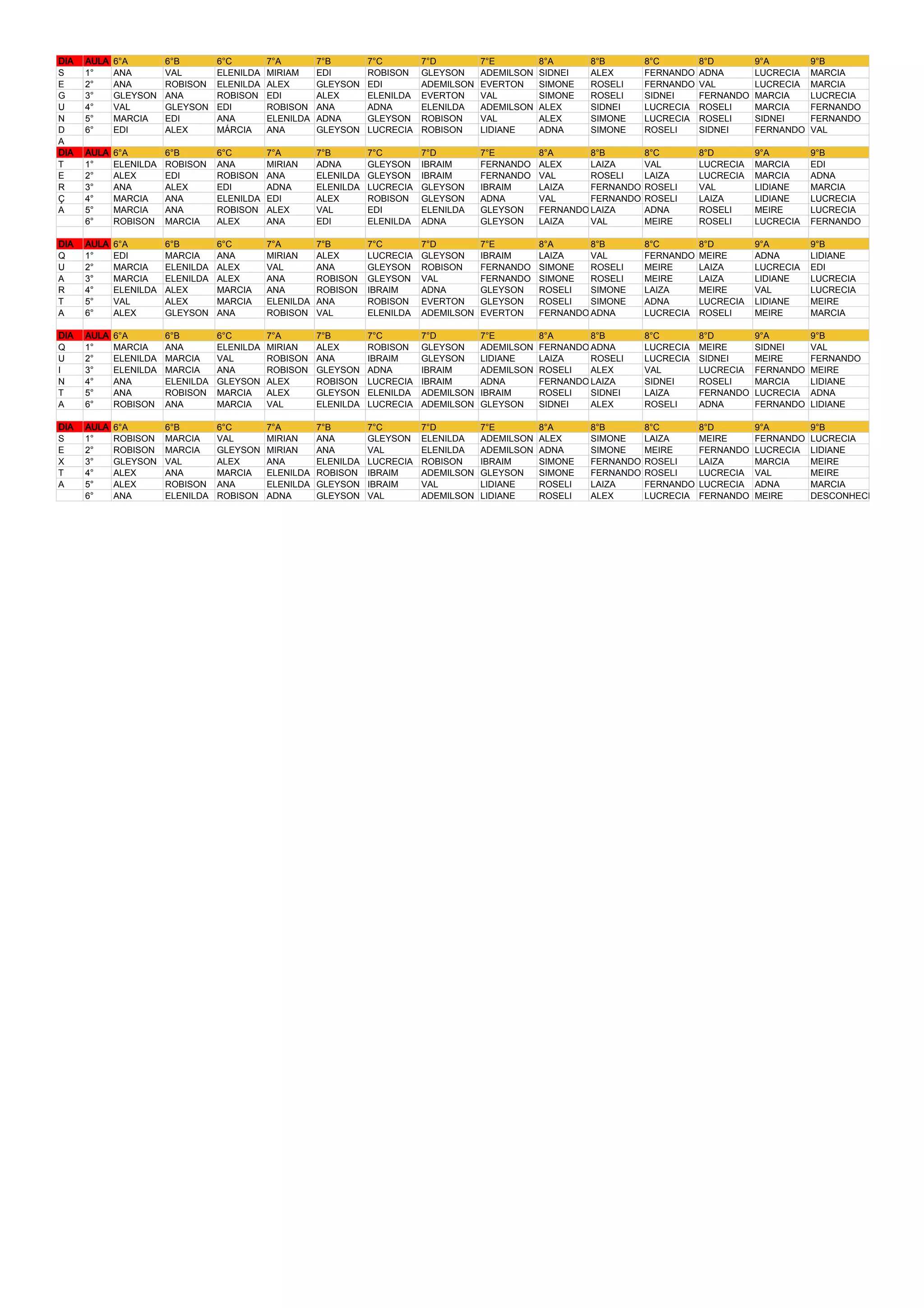 The document contains schedules assigning students to classrooms for different days of the week. It lists the classrooms for grades 6 through 9 and names of students assigned to each classroom for periods 1 through 6 of the day. The classrooms and roster of students change each day to allow students to attend different lessons.