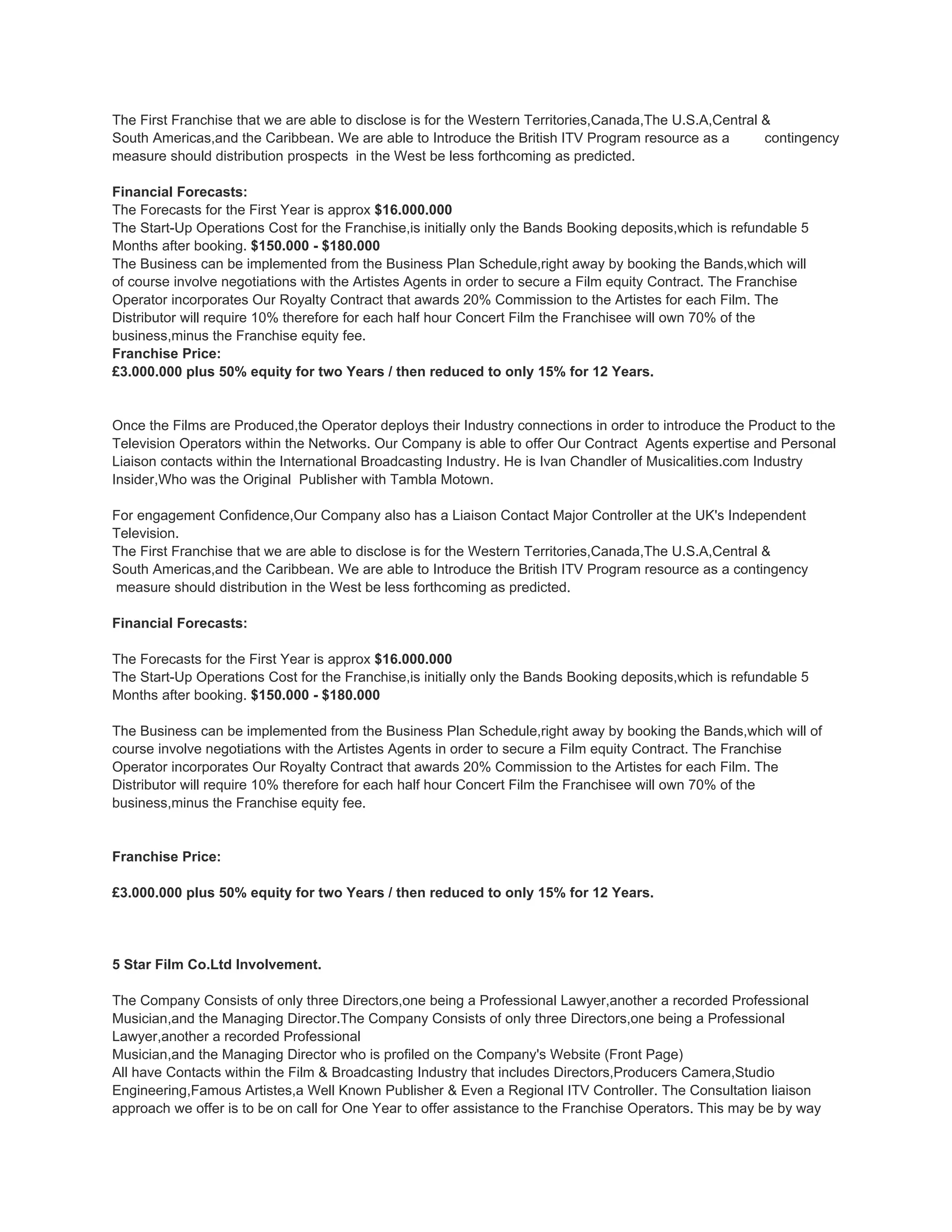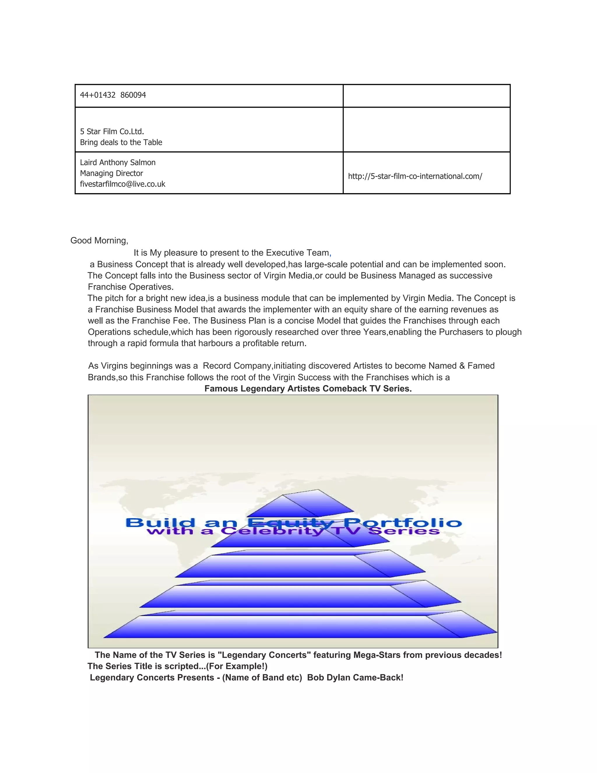 Laird Salmon of 5 Star Film Co. Ltd. is pitching a business concept of a franchise model to produce and distribute concert films of legendary artists from previous decades called "Legendary Concerts", with an initial franchise territory covering Western countries. The franchisee would book artists, film concerts, own 70% of each film minus franchise fees, and have support from 5 Star Film Co.'s industry contacts; financial forecasts project $16 million in revenue the first year.