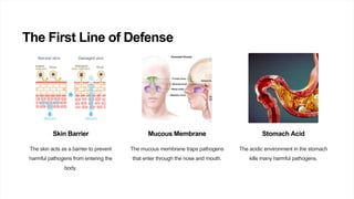The immune system protects the body from pathogens through a variety of cells and processes. It has both innate defenses like skin, mucus, and stomach acid, as well as adaptive responses mediated by B cells, T cells, macrophages, and natural killer cells. The adaptive immune response involves activation of T cells by antigen-presenting cells, proliferation of effector T cells, and the creation of memory T cells. Immunizations boost immunity by training the immune system to recognize pathogens without causing disease.