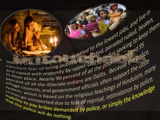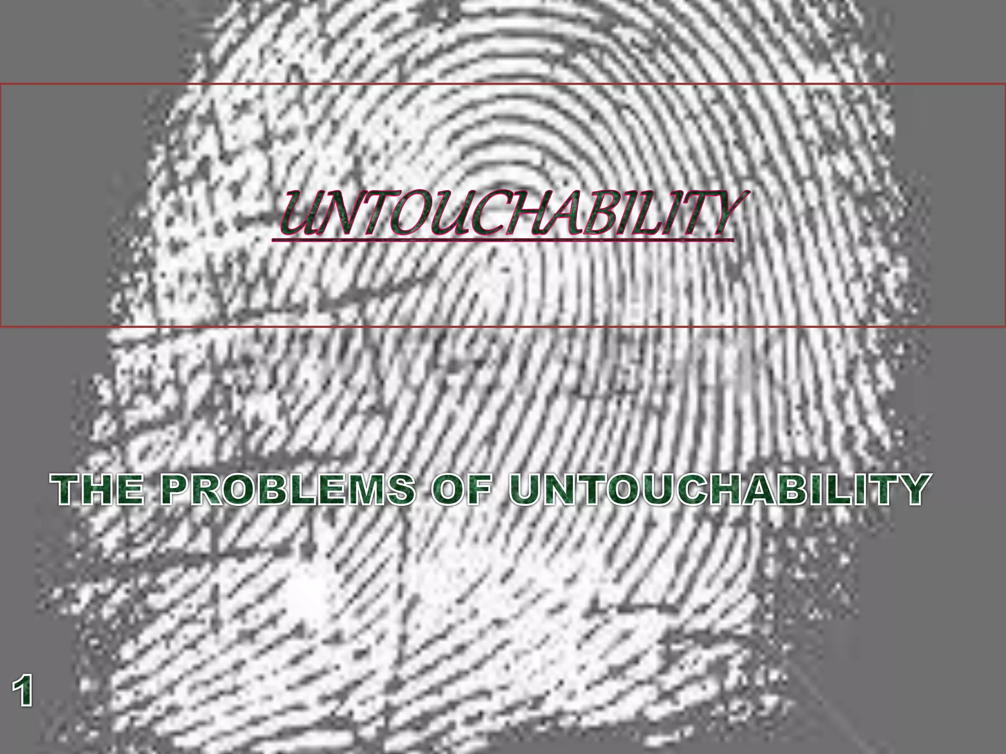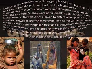 The document discusses the concept of untouchability, a social system in which individuals' social status and roles are determined by their birth, primarily affecting the Dalit community in India. It highlights the problems faced by untouchables, including severe discrimination, poverty, and limited access to education and employment. Key leaders like Dr. Bhim Rao Ambedkar and Mahatma Gandhi are mentioned for their efforts to eradicate untouchability and support civil rights.