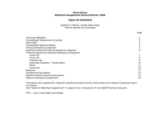 This document is a statistical supplement from Unum Group for the second quarter of 2008. It includes financial highlights and consolidated financial statements for Unum for quarters, six month periods, and full years 2005-2007. It also includes sales data by segment (Unum US, Unum UK, Colonial Life, etc.) and notes on non-GAAP measures and items affecting results for specific periods. The document provides an overview of Unum's financial and operating results over several years through tables, charts, and explanatory notes.