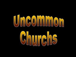 The document presents photos and descriptions of various churches from around the world. It includes details about churches built in unusual architectural styles, such as the Chapel of Notre-Dame-du-Haut designed by Le Corbusier with curved thick walls that let in indirect light. It also describes churches constructed in remarkable locations, such as the Cathedral of Our Lady of the Glory in Brazil inspired by Sputnik and with an external height of 114 meters. The document showcases the diversity of architectural structures, histories, and religious monuments found in churches globally.