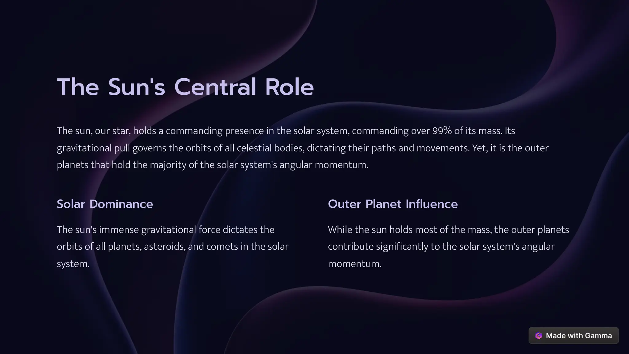 The document explores the structure and dynamics of the solar system, emphasizing the sun's central role and the gravitational influences that dictate planetary orbits. It discusses the differences between inner terrestrial planets and outer gas giants, outlining their physical characteristics and compositions. Additionally, it examines the Titius-Bode law and the elemental abundance across celestial bodies, suggesting a common origin for the solar system.