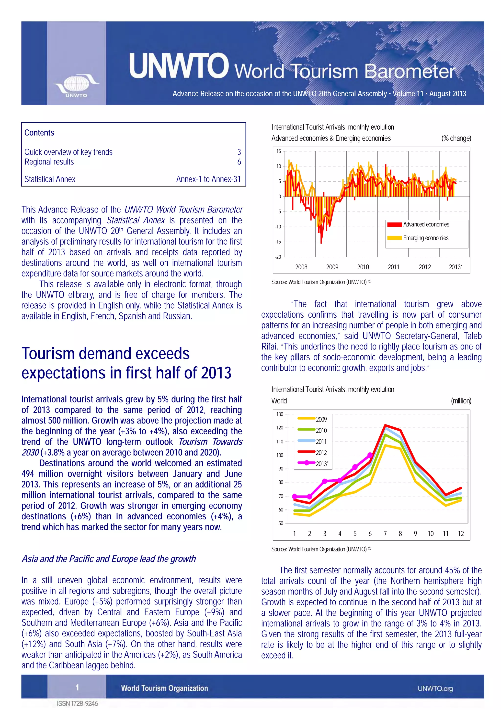 International tourism grew above expectations in the first half of 2013, with arrivals increasing 5% compared to the same period in 2012. An estimated 494 million tourists traveled between January and June 2013, 25 million more than the previous year. Growth was stronger in emerging economies (+6%) than advanced economies (+4%). Europe and the Asia-Pacific region led growth, at +5% and +6% respectively. Tourism is expected to continue growing in the second half of 2013, though at a slower pace, with full-year growth forecast to be at the higher end of the previous 3-4% projection or slightly exceed it.