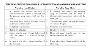 The document discusses rotameters and centrifugal pumps. It provides details on the construction and working principles of rotameters, which measure flow rate by relating the position of a floating indicator to flow. The pressure drop is constant and area of flow varies. Centrifugal pumps are also covered, explaining they work by increasing the kinetic energy and converting it to pressure energy using a rotating impeller in a casing. Key factors for selecting between pump types are flow rate, head, liquid properties and power requirements.