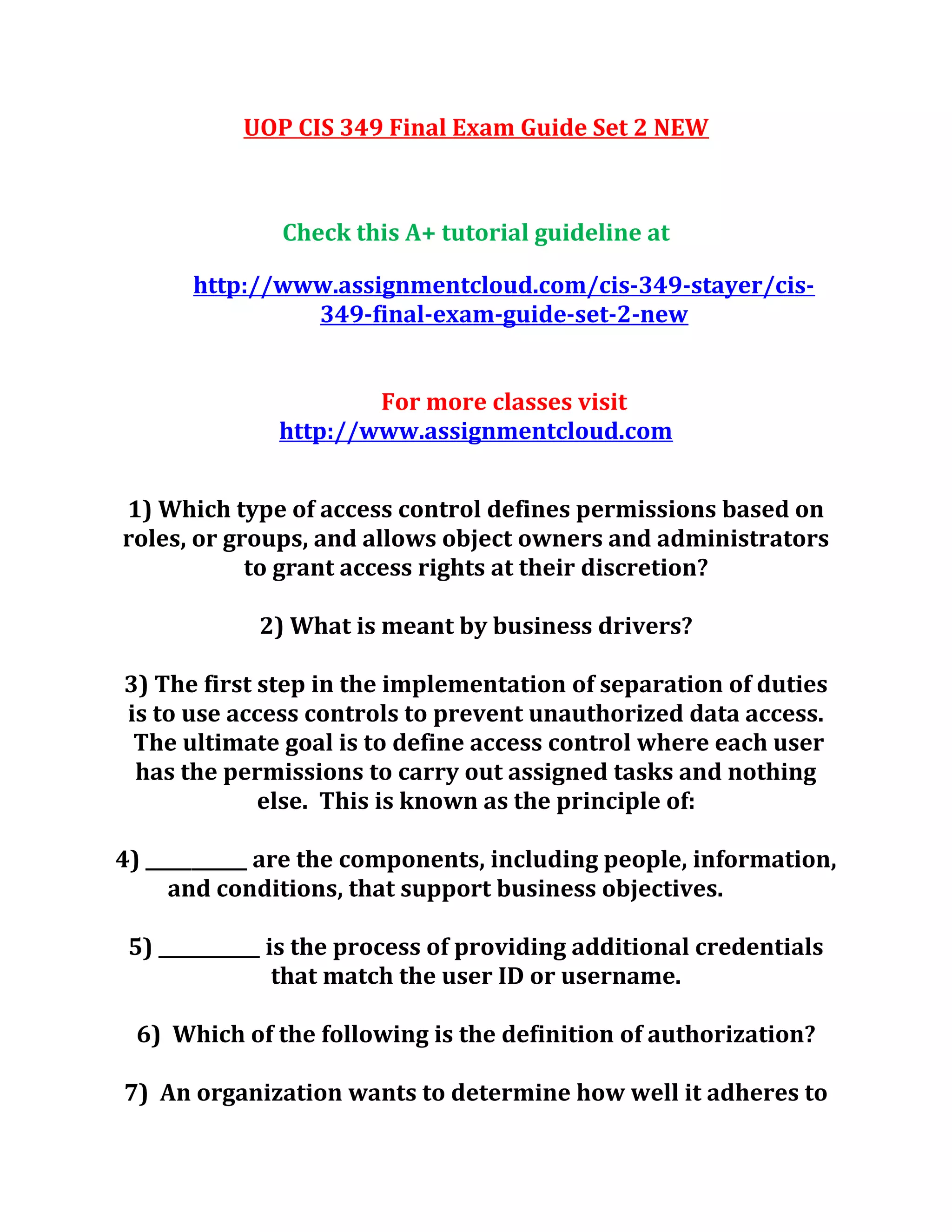 The document is a guide for the CIS 349 final exam, presenting a series of questions related to access control, security policies, and network monitoring. It covers topics such as the principle of least privilege, business drivers, types of controls in LAN and WAN domains, encryption strategies, and monitoring protocols. Additionally, it touches on organizational responsibilities regarding security assessments and incident response plans.