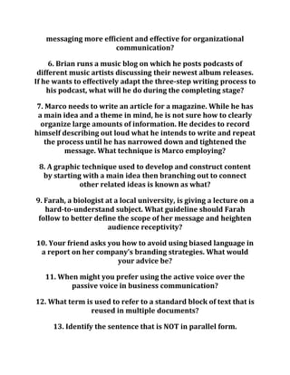 The document presents a series of questions related to communication tools, techniques for effective writing, and strategies for presenting information in a professional context. Topics include instant messaging efficiency, podcasting protocols, organization of ideas, and guidelines for audience engagement. It also touches upon language usage, structural elements in documents, and visual formatting in written communication.