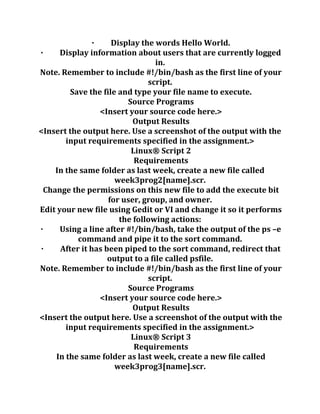 The document outlines a week 3 Linux script worksheet for a course, detailing specific scripting tasks that include creating and executing several shell scripts. Students are required to manipulate file permissions, display information, sort outputs, and perform calculations based on values in files. Additionally, it emphasizes the importance of including the shebang line in scripts and capturing output results with screenshots.