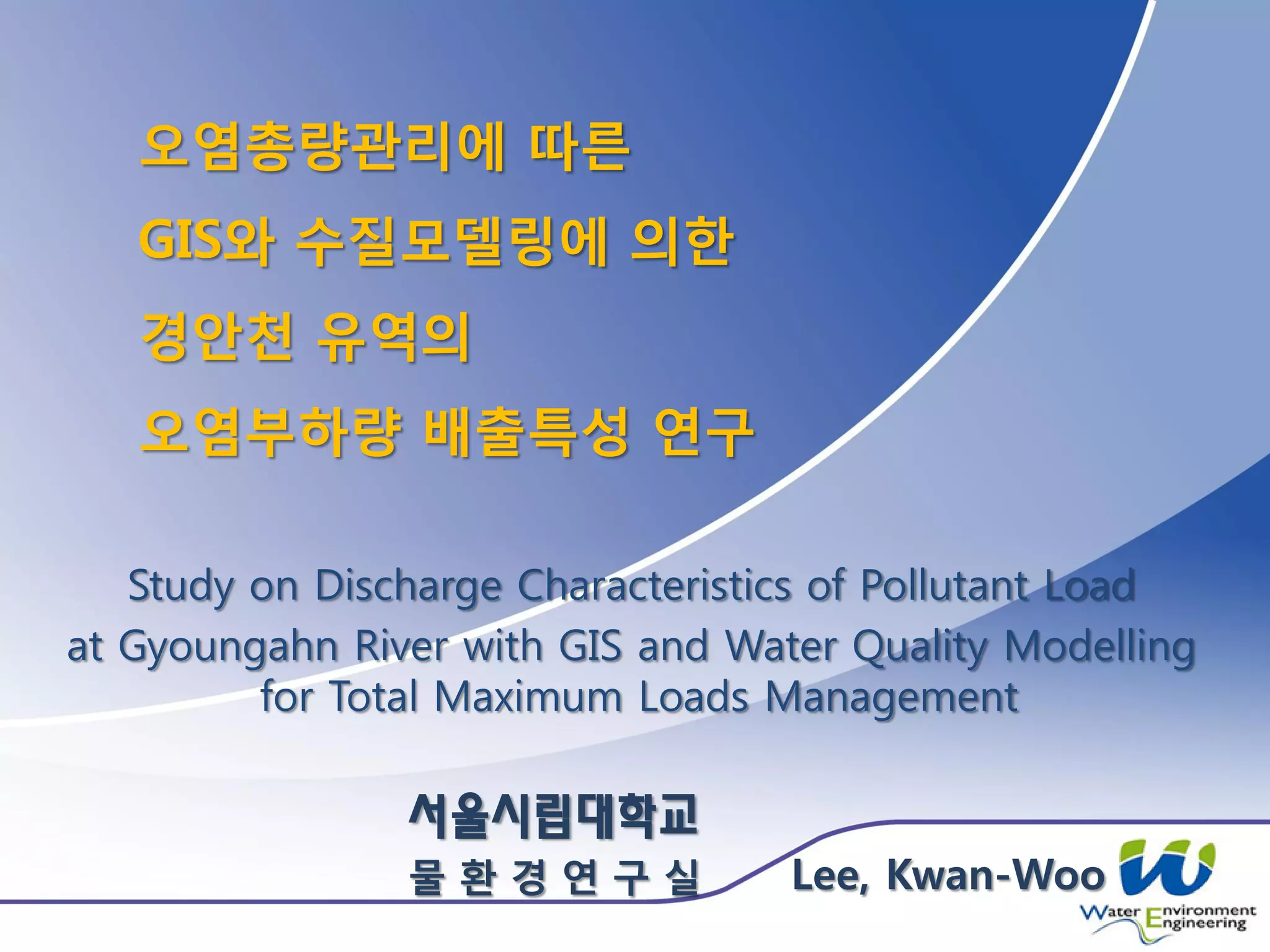 The study used GIS and the SWAT water quality model to estimate pollutant loads from point and non-point sources in the Gyoungahn River watershed. The SWAT model was set up using spatial data on soils, land use, and climate inputs. Model parameters were modified to better represent the steep slopes and narrow channels common in Korean rivers. Model outputs for flow, sediments, nitrogen, phosphorus and BOD showed good agreement with observed data based on statistical evaluations. The study demonstrated the ability of a modified SWAT model to estimate pollutant loads for the purposes of total maximum daily load management in the watershed.