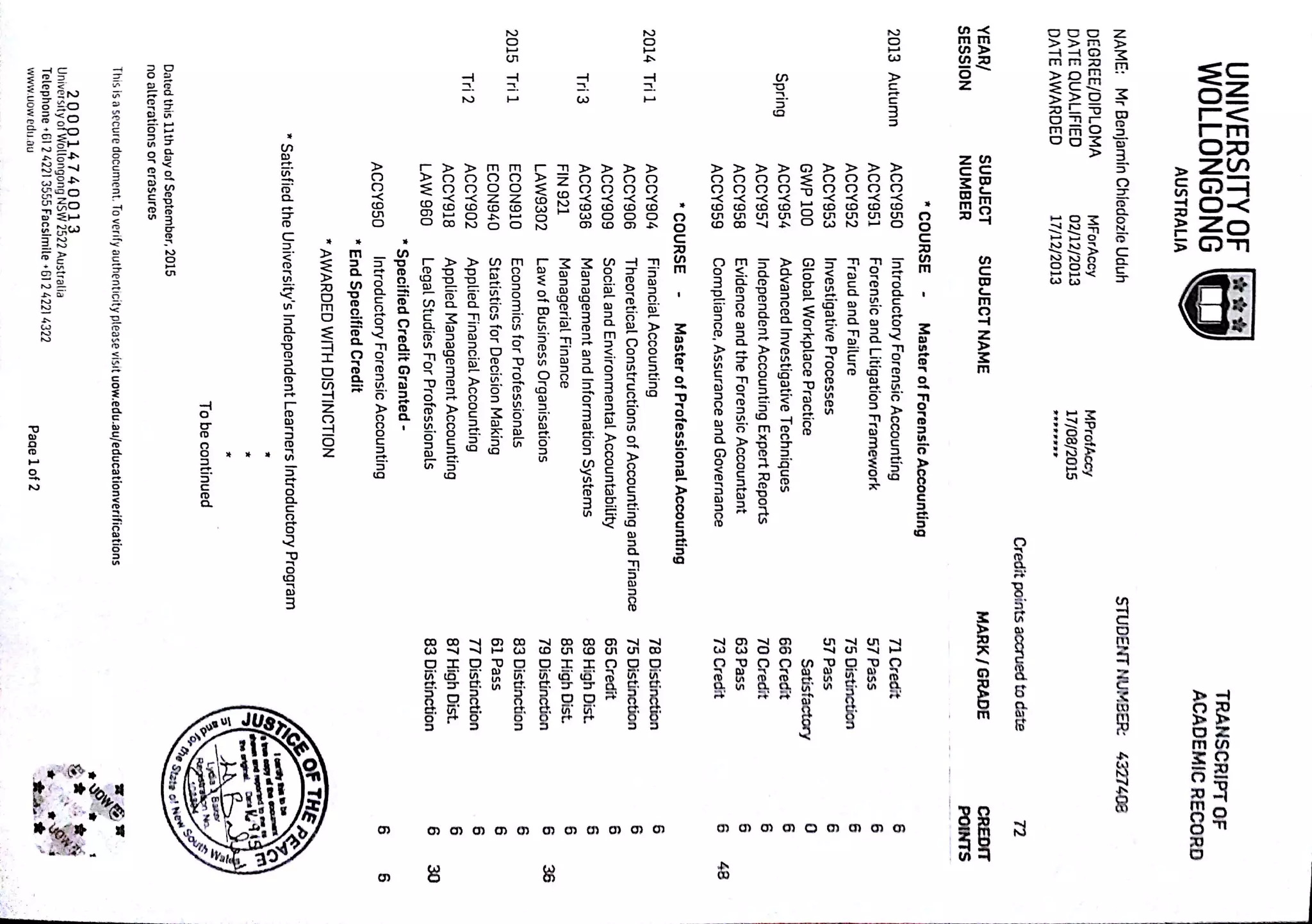 UCT Transcript of official academic record PDF