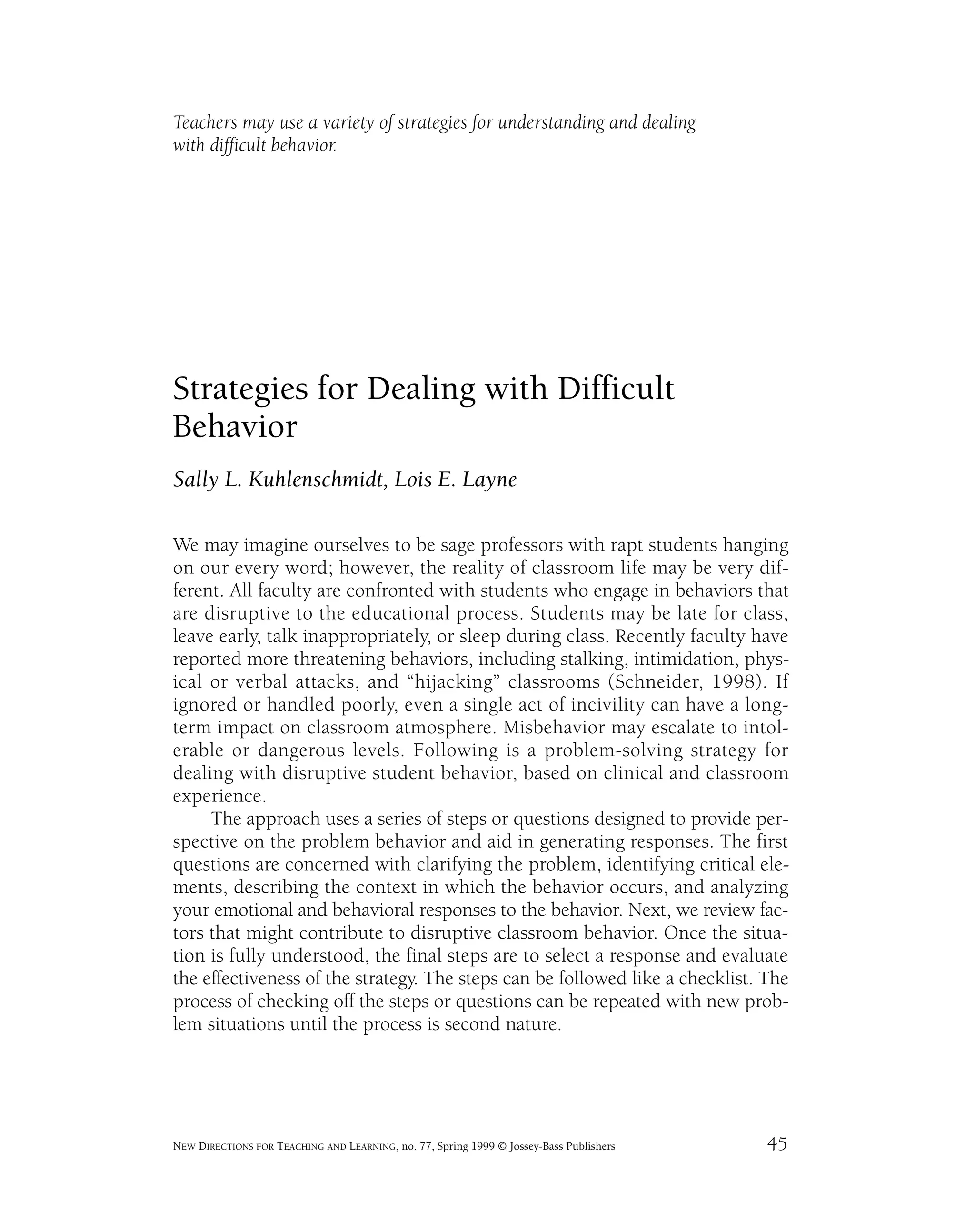 The document provides a problem-solving strategy for teachers to address disruptive student behavior in the classroom. The strategy involves clearly describing the problem behavior, understanding the context and factors contributing to it, and selecting and evaluating responses. It advises teachers to objectively describe behaviors, consider when and why they occur, who is affected, and any risks, before determining how to respond in a constructive manner. The goal is to resolve issues and prevent escalation, while ensuring student and classroom safety.